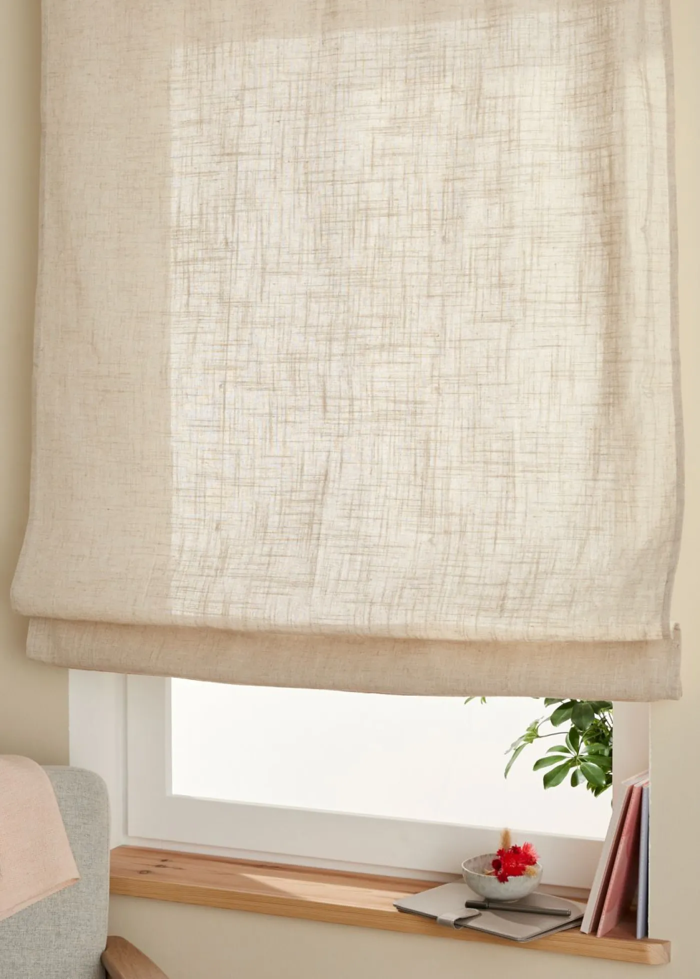 Decoración de ventana moderna. Puedes decorar tu pequeña ventana con el estor en un moderno aspecto de lino o combinarlo con una cortina. Se puede ajustar a la altura deseada y fijar con el tope para personalizar el diseño del frontal de la ventana.