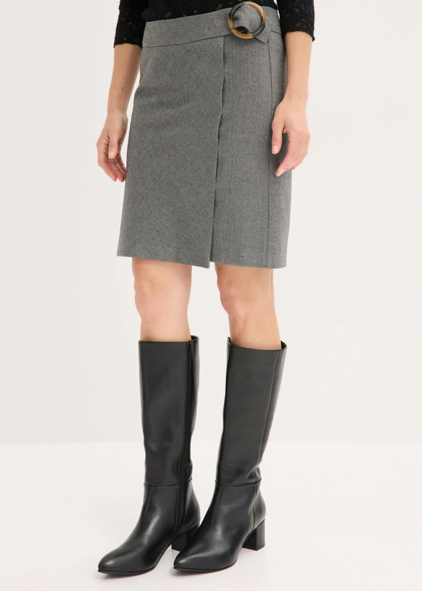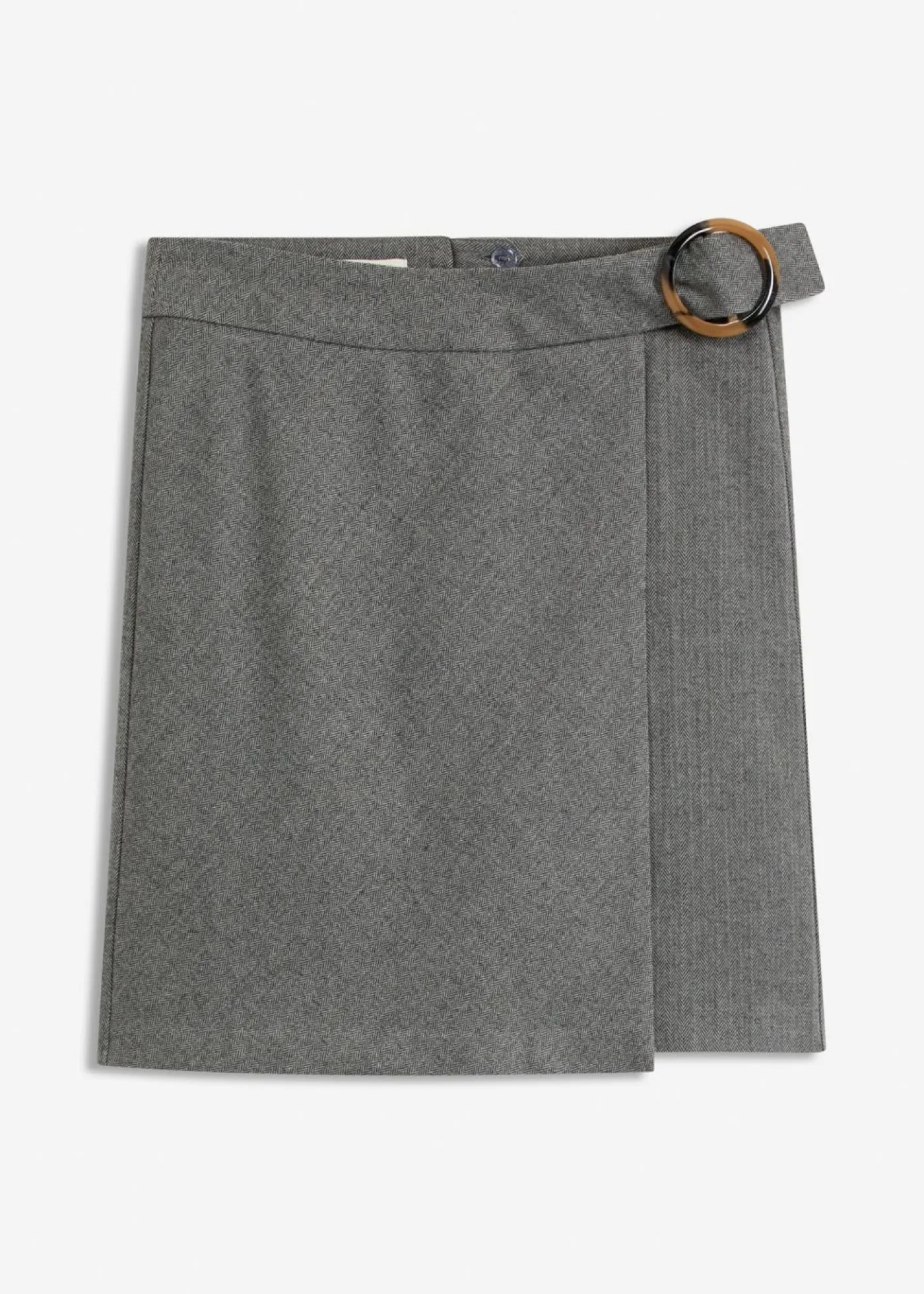 Elegante falda con patrón de espiga y hebilla decorativa.
