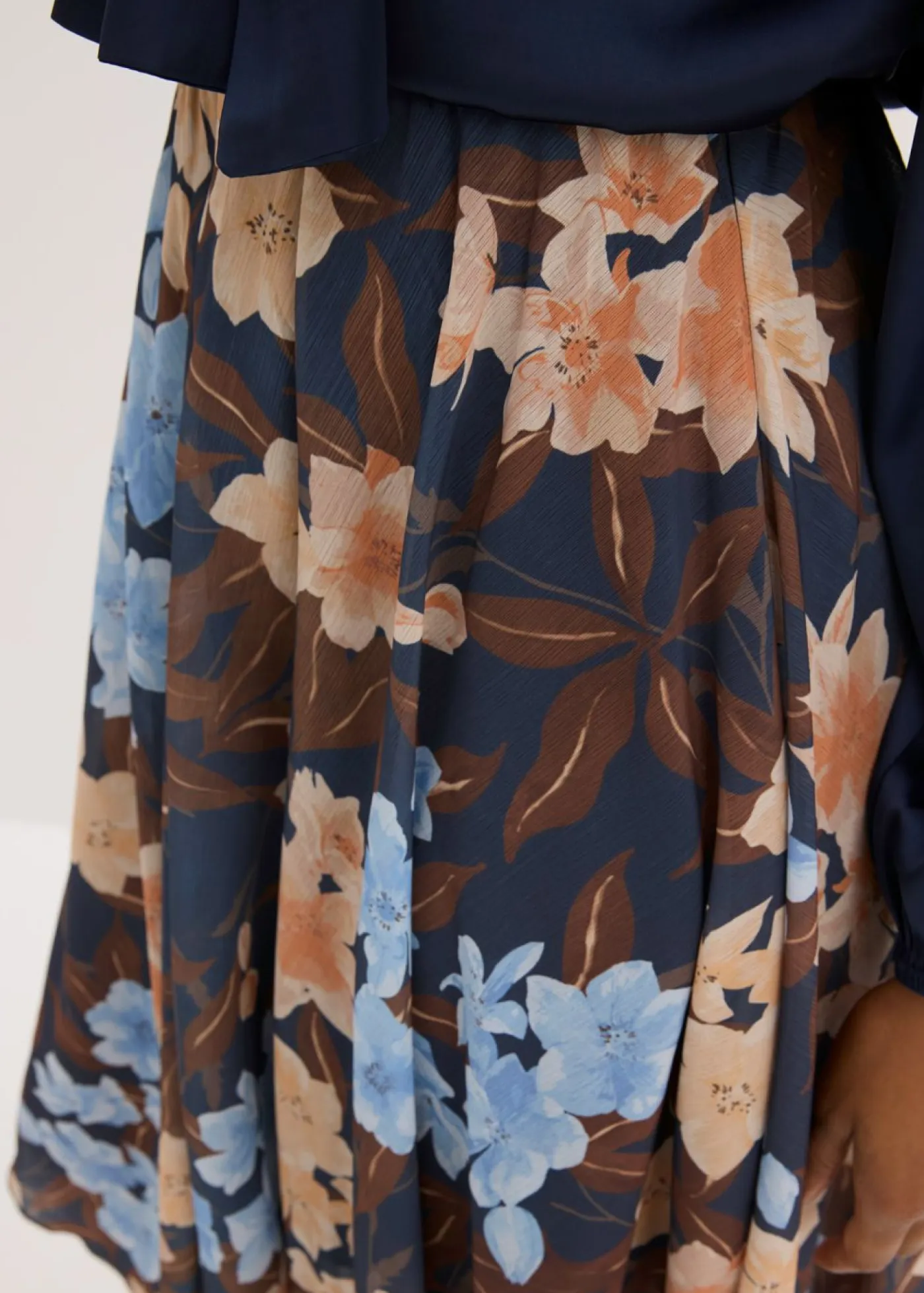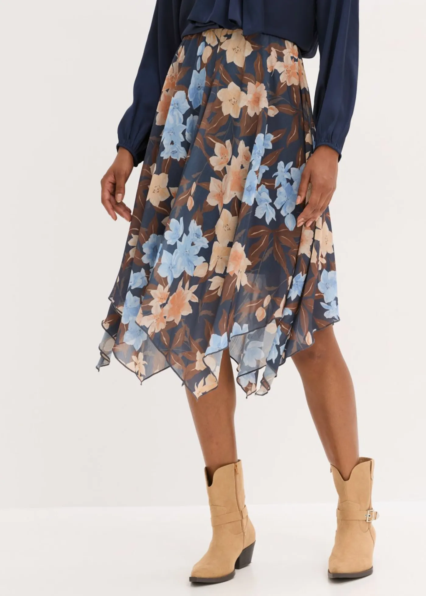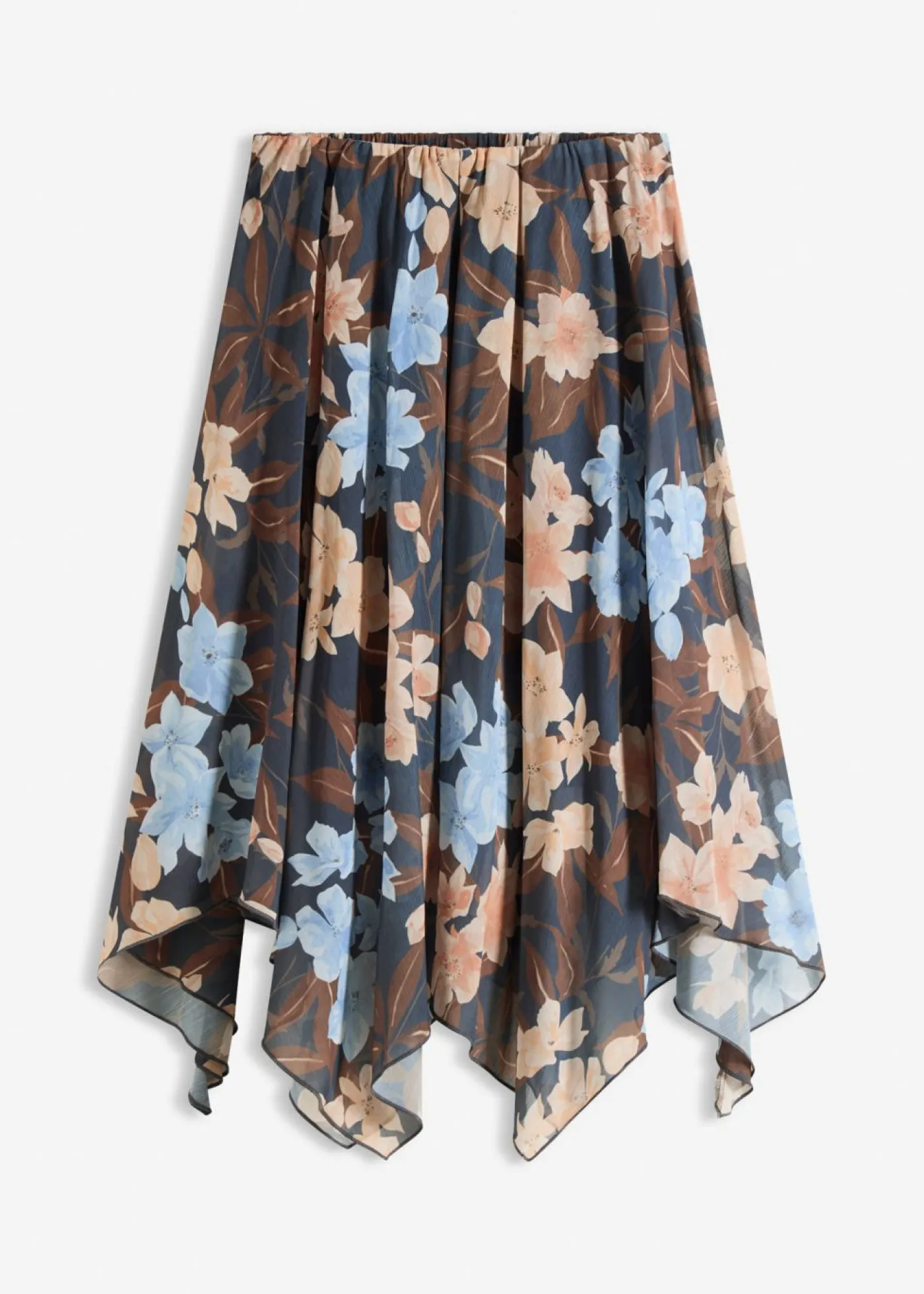 Falda midi de gasa con estampado de flores, dobladillo asimétrico y cinturilla elástica.