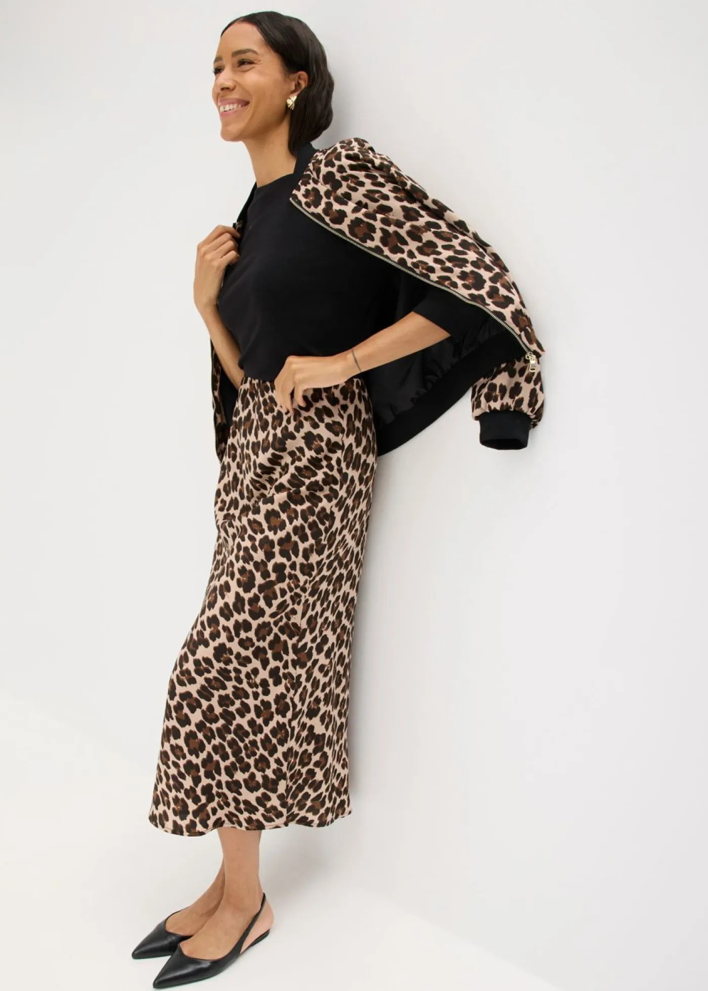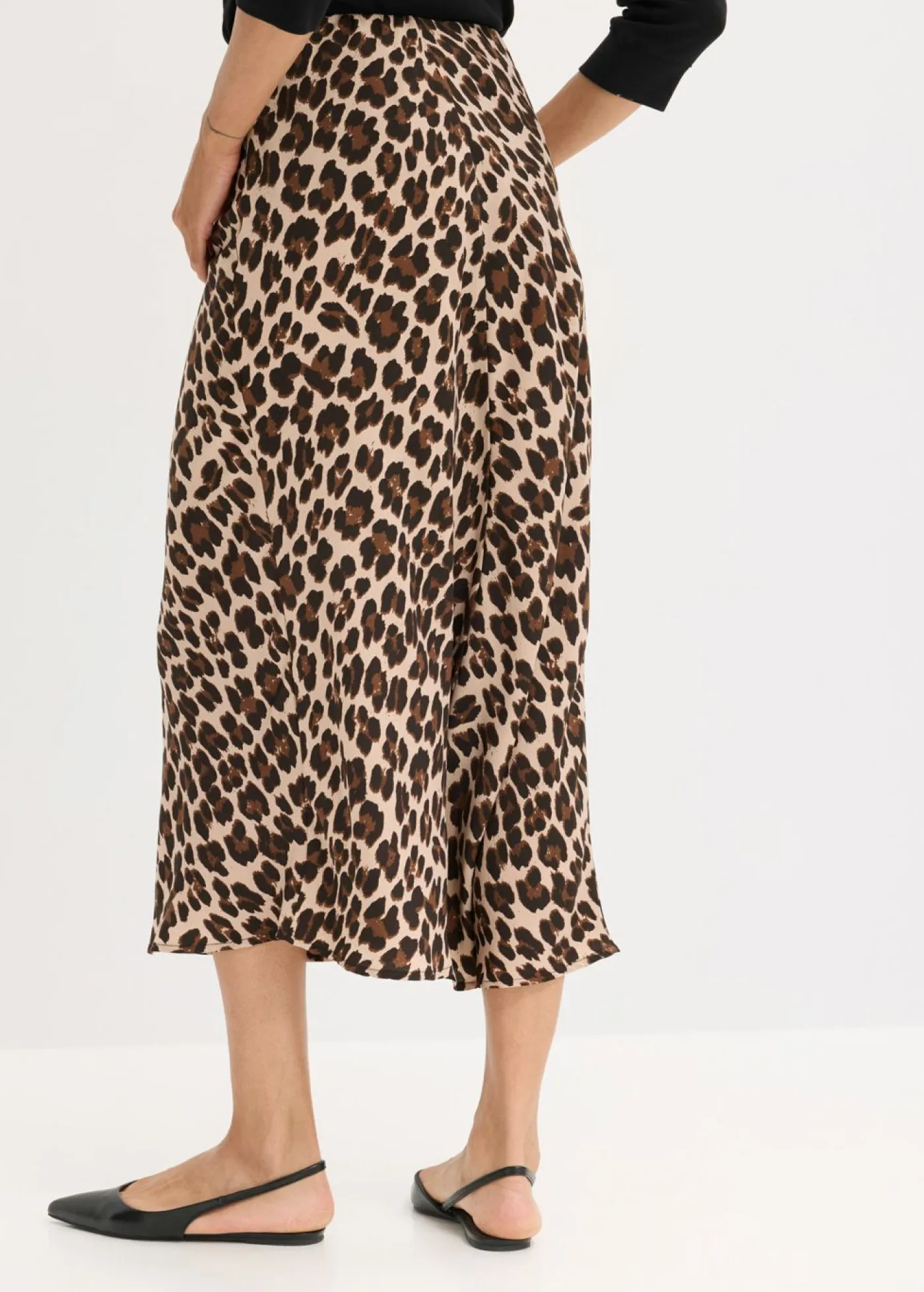 Falda de satén fluido con estampado moderno, largo midi y cinturilla elástica.