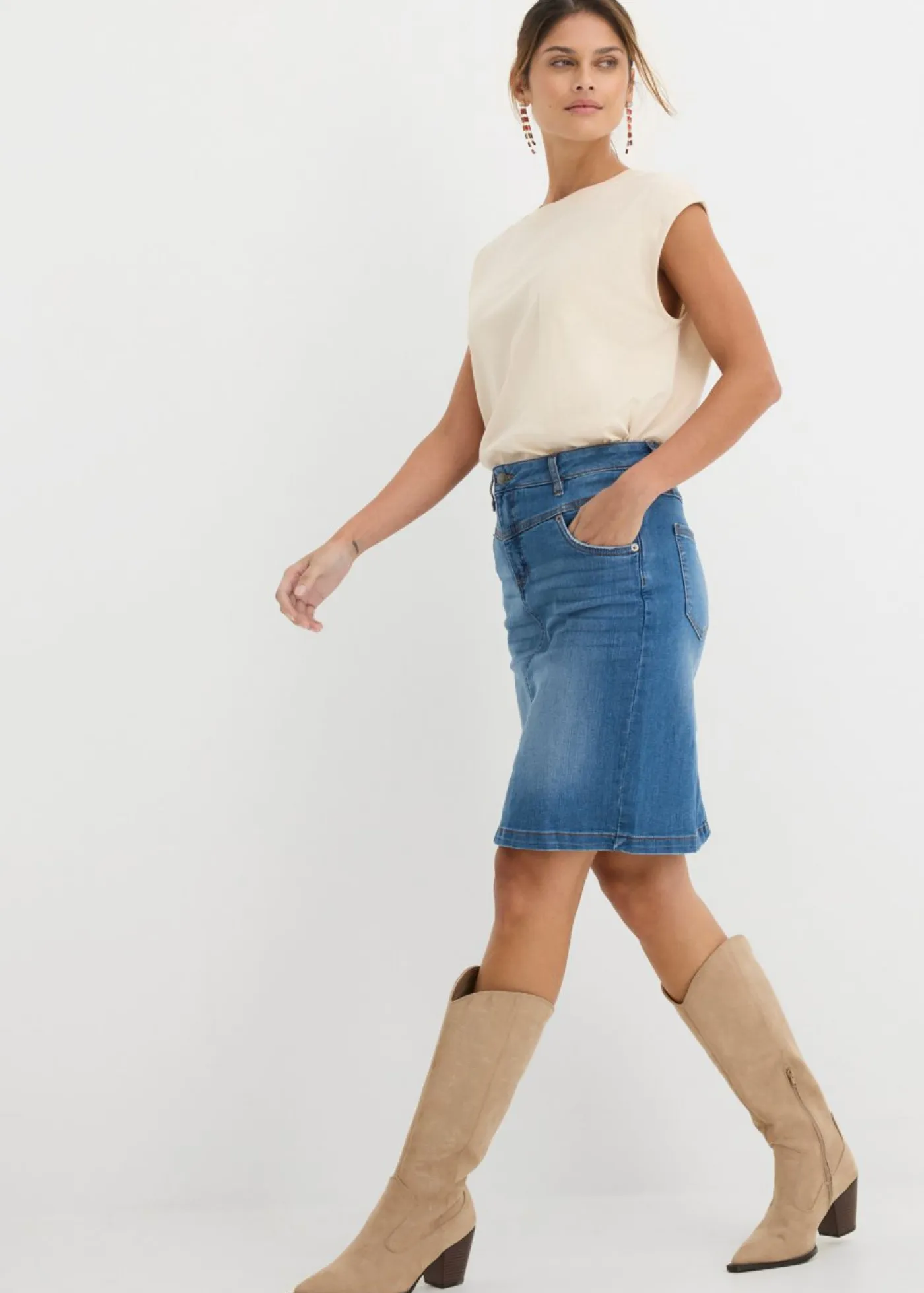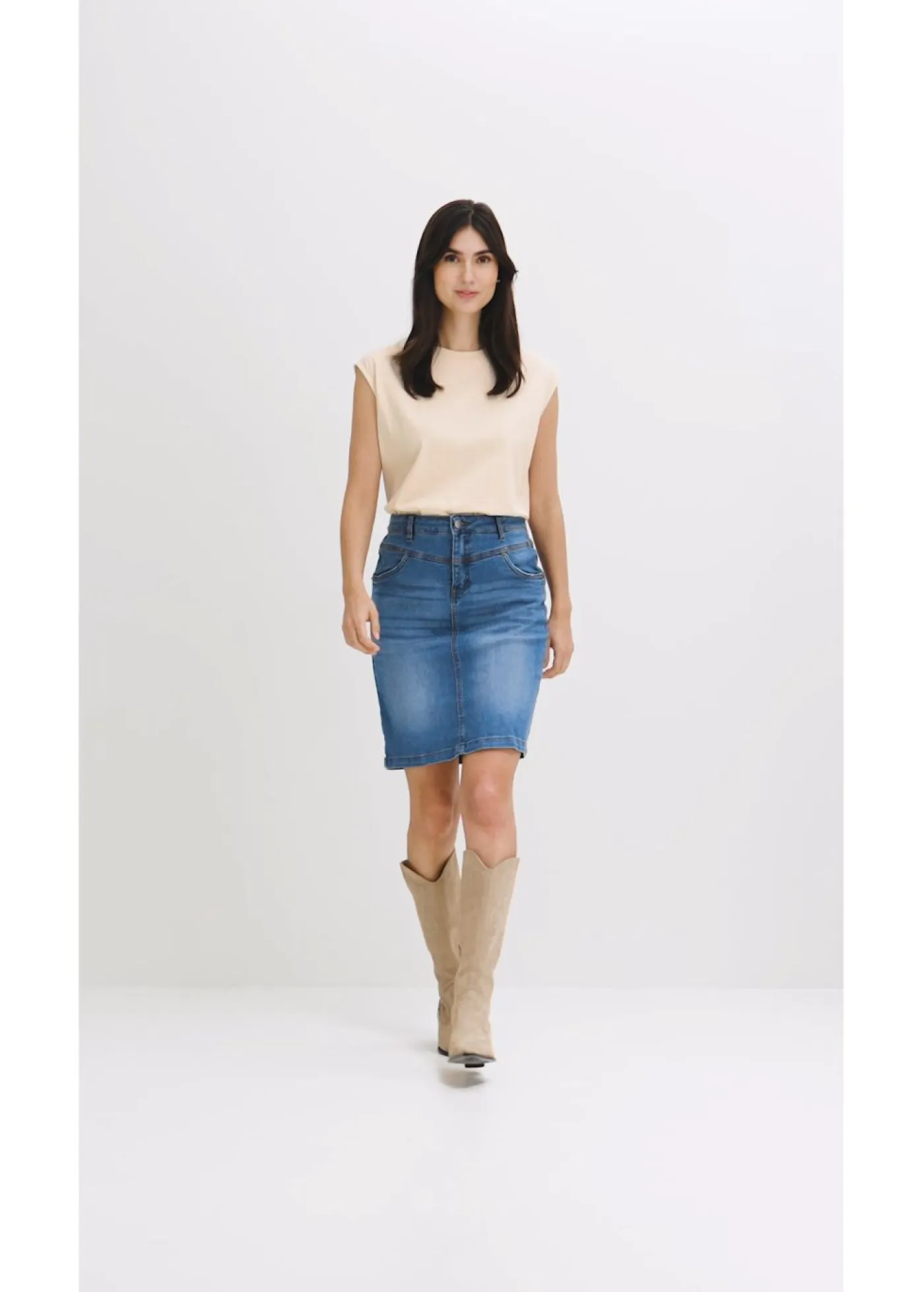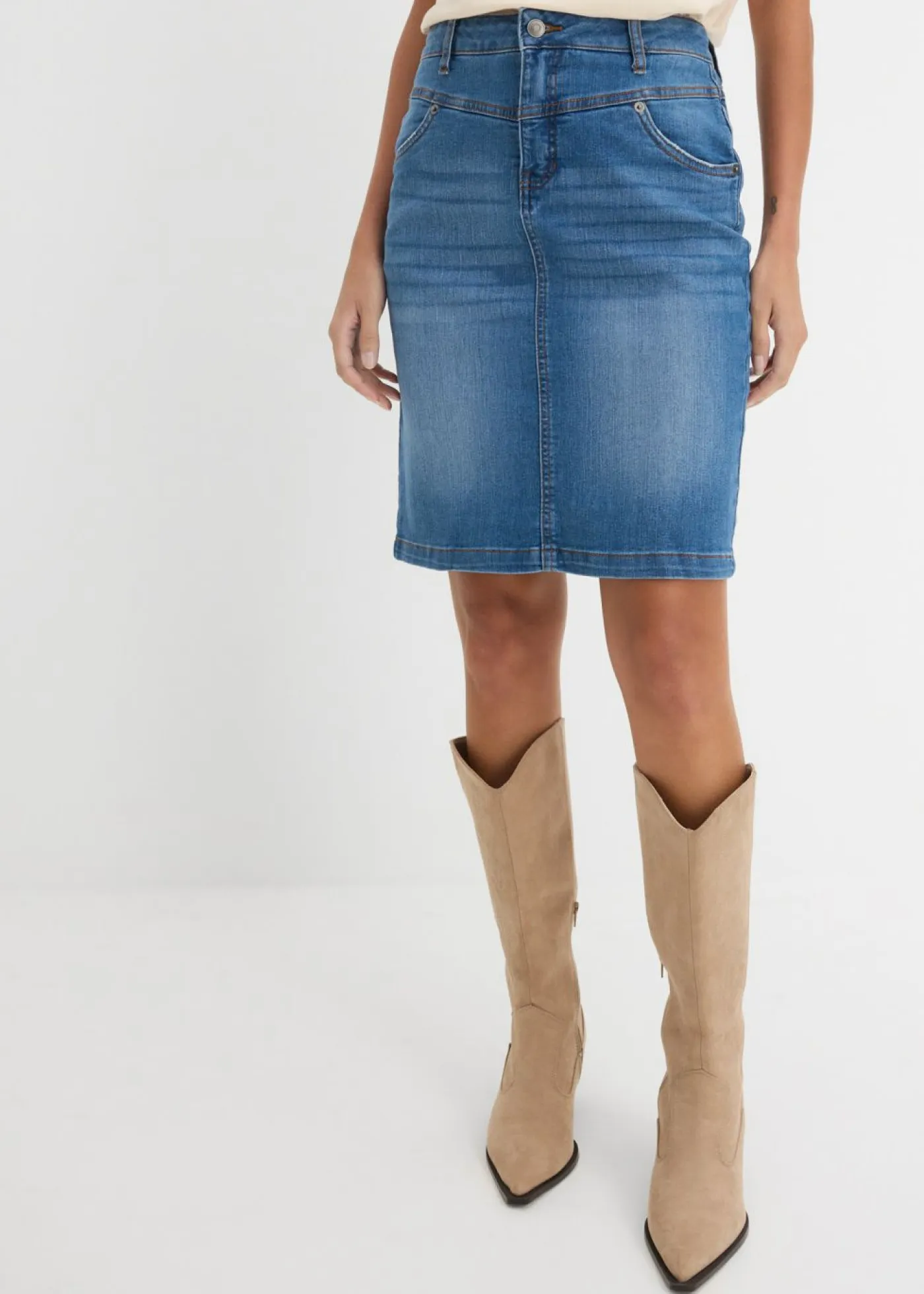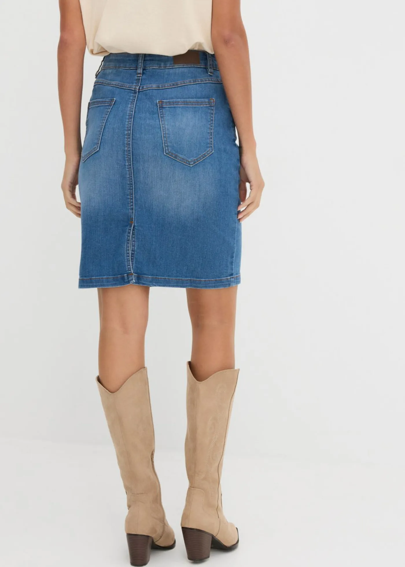 Falda vaquera ajustada y elástica. Largo de aprox. 56 cm en talla 42. Se puede lavar a máquina.