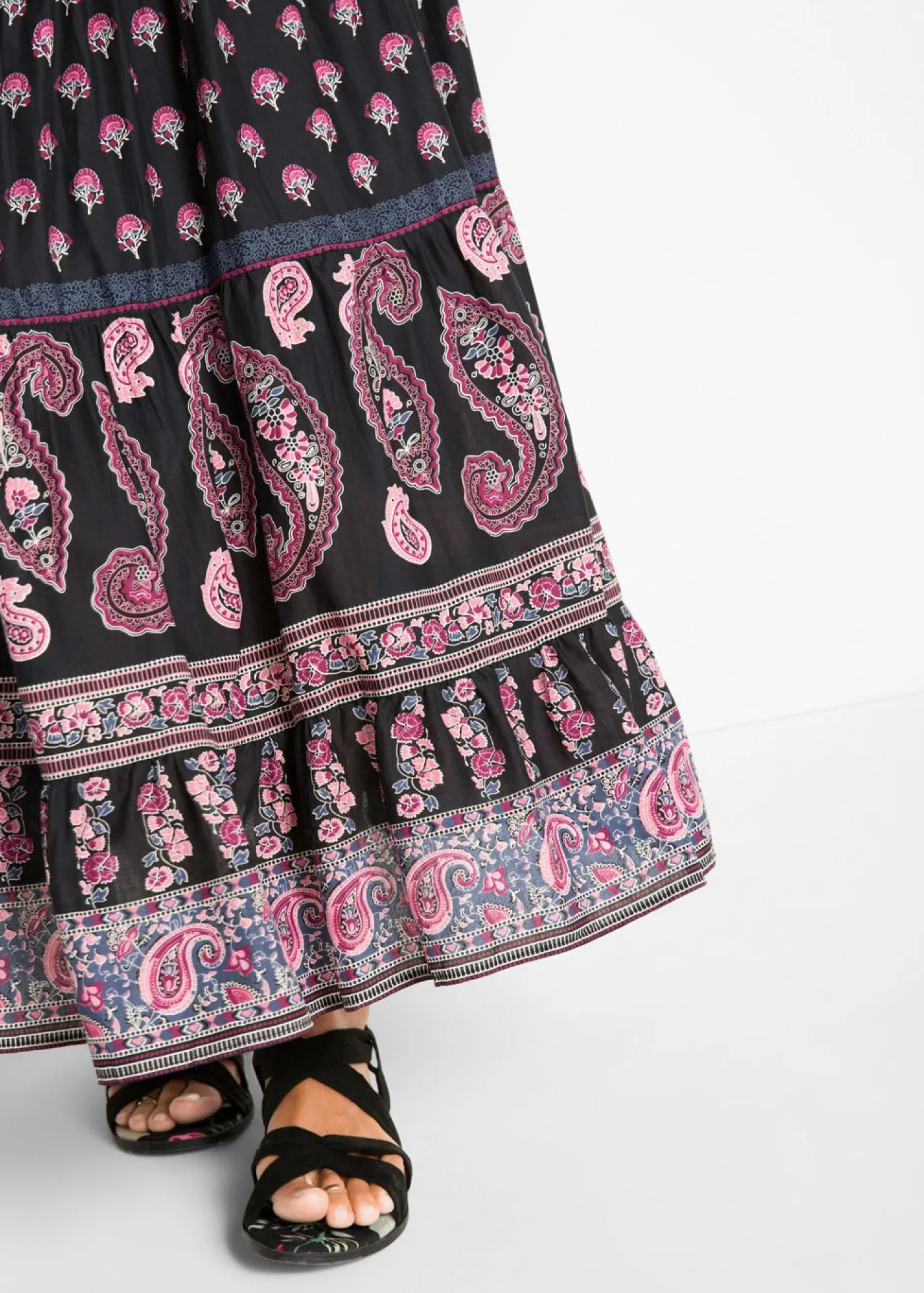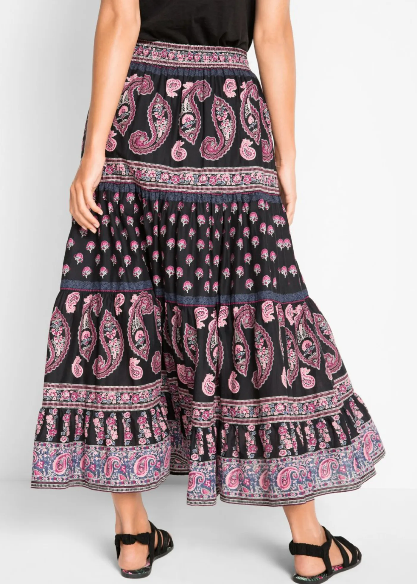 Encantadora falda larga de algodón puro con cinta decorativa. La falda larga de la marca bpc destaca por su corte favorecedor y su bonito estampado. Gracias a su corte sofisticado con cinturilla elástica y tejido cosido a capas, la falda favorece visualmente. El cordón permite ajustar cómodamente el ancho de la cintura. La falda larga de algodón elástico combina perfectamente con un top sencillo. Cada estampado es único. Largo de aprox. 94 cm en talla 42. Se puede lavar a máquina.