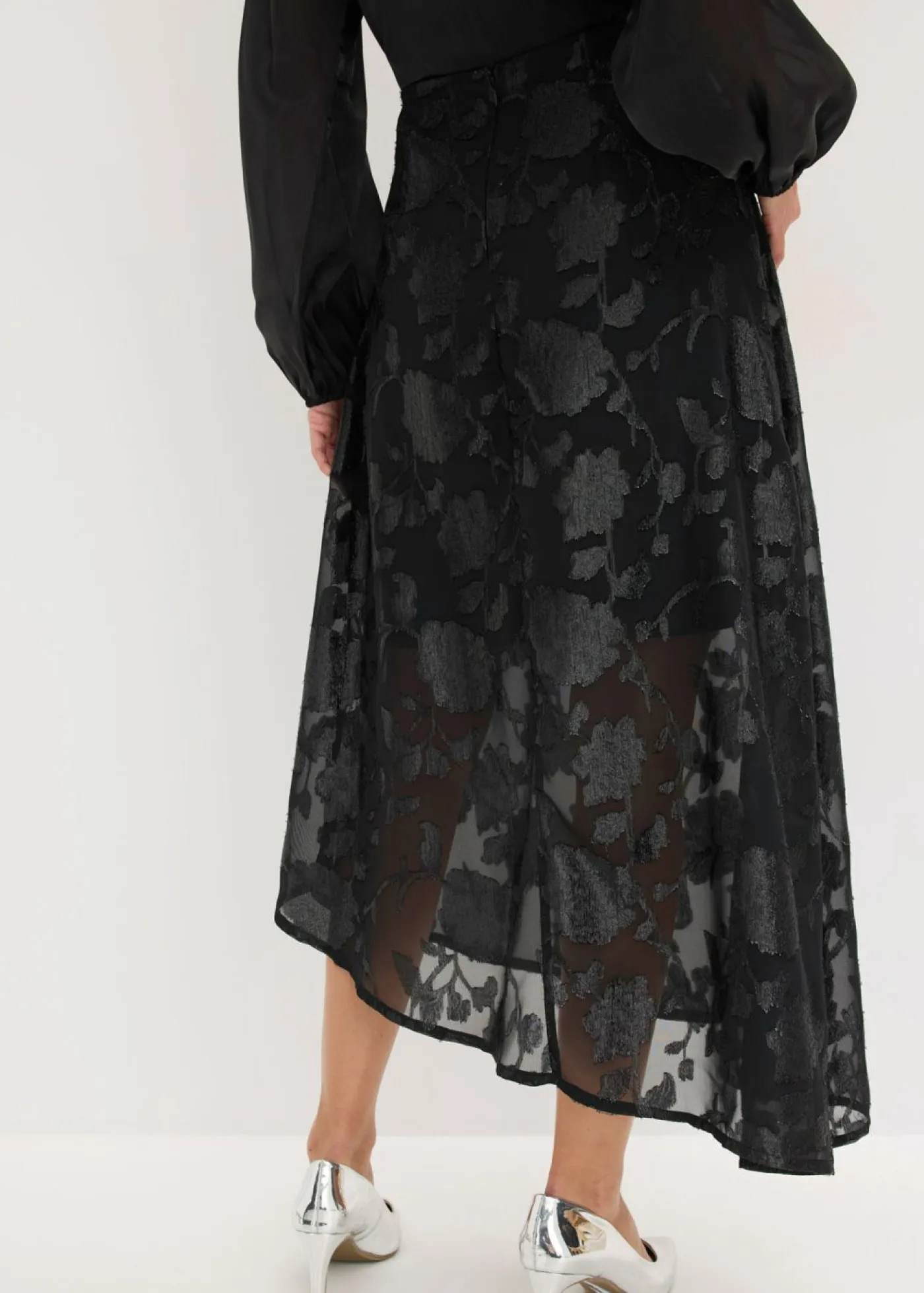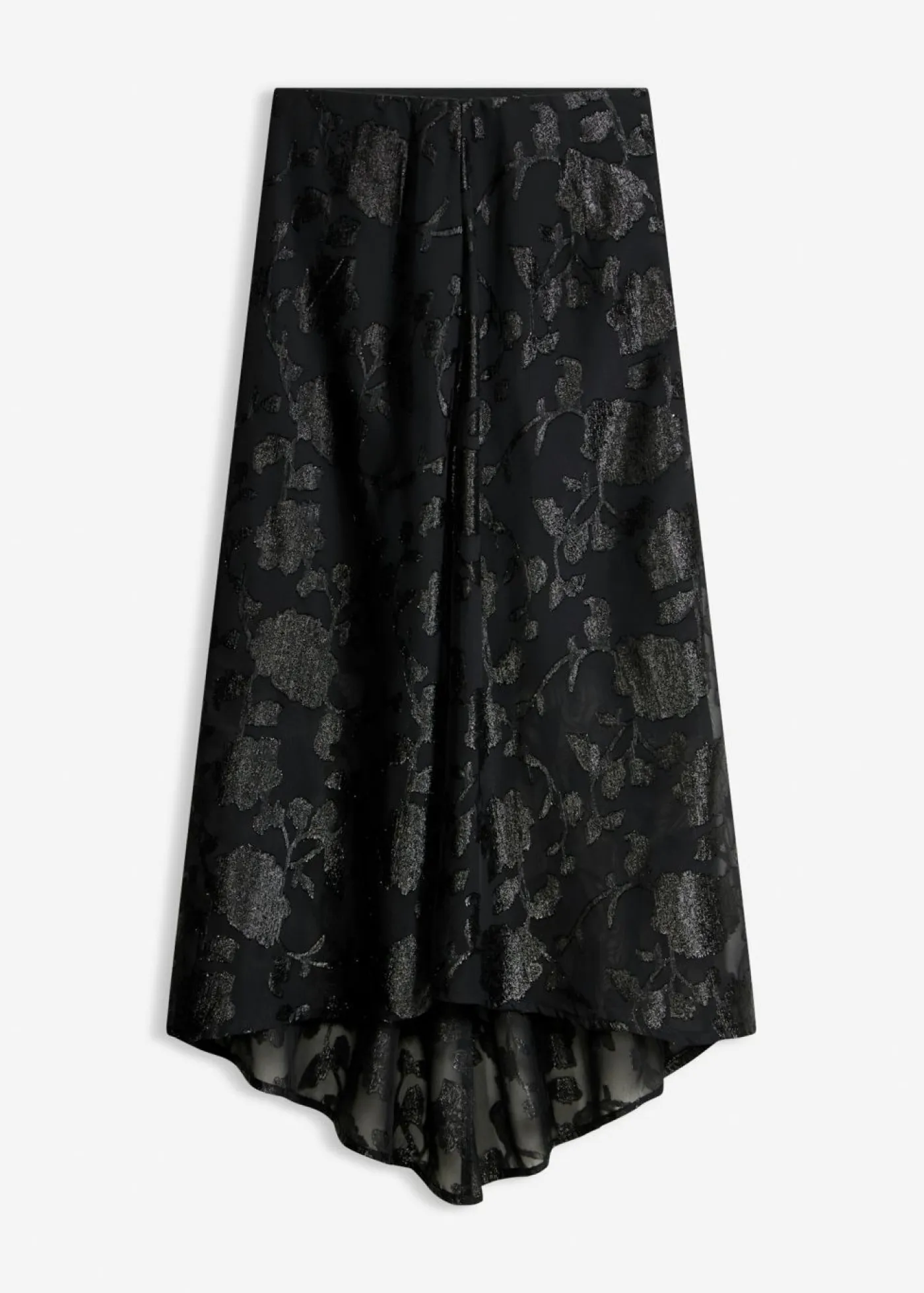 Moderno y femenino: Falda larga con bordado brillante y dobladillo asimétrico.