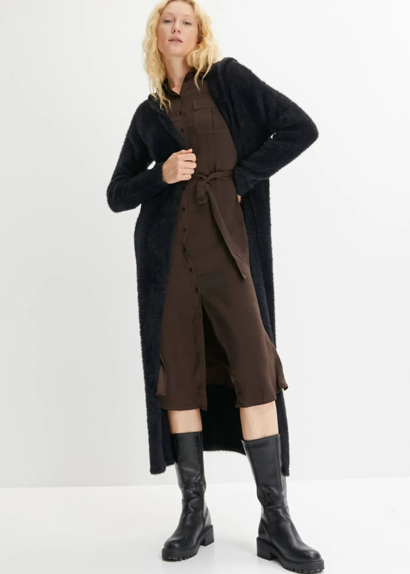 Abrigo largo de punto con capucha con viscosa. Largo de aprox. 114 cm en talla 40/42. Se puede lavar a máquina.