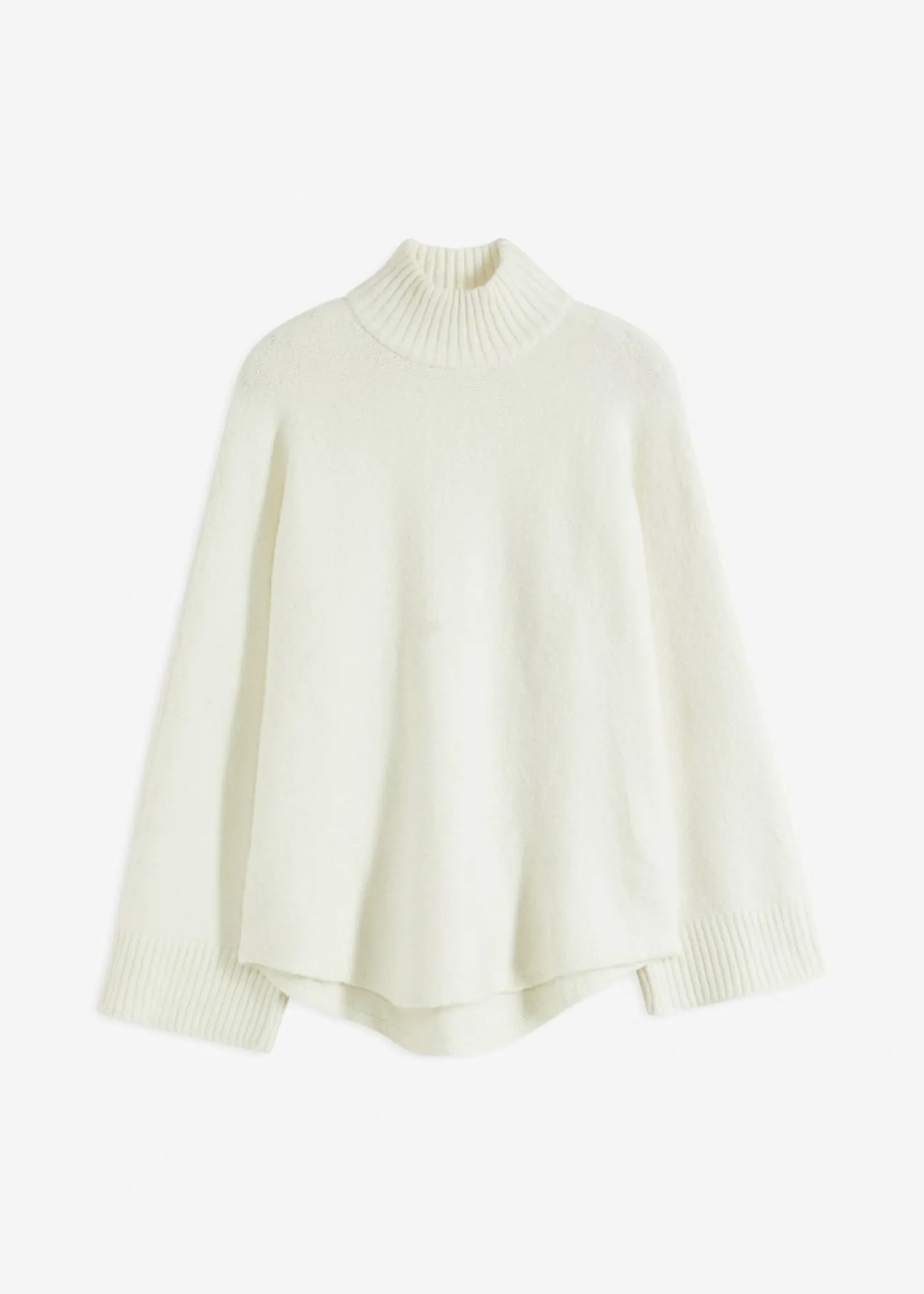 Moderno jersey con cuello alto, dobladillo redondeado y mangas anchas.