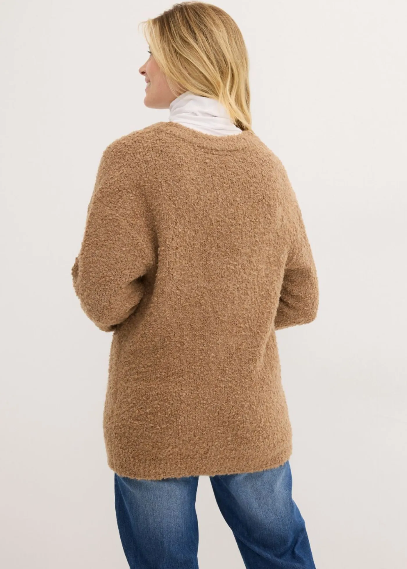 Jersey holgado de bouclé con escote en V. Largo de aprox. 74 cm en talla 40/42. Se puede lavar a máquina.
