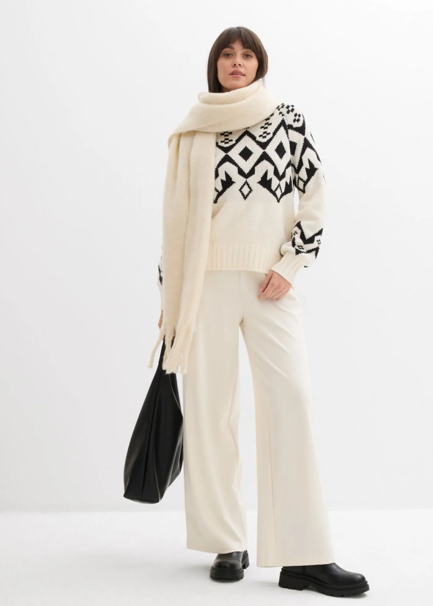 Moderno jersey oversize de estilo noruego con diseño monocromático.