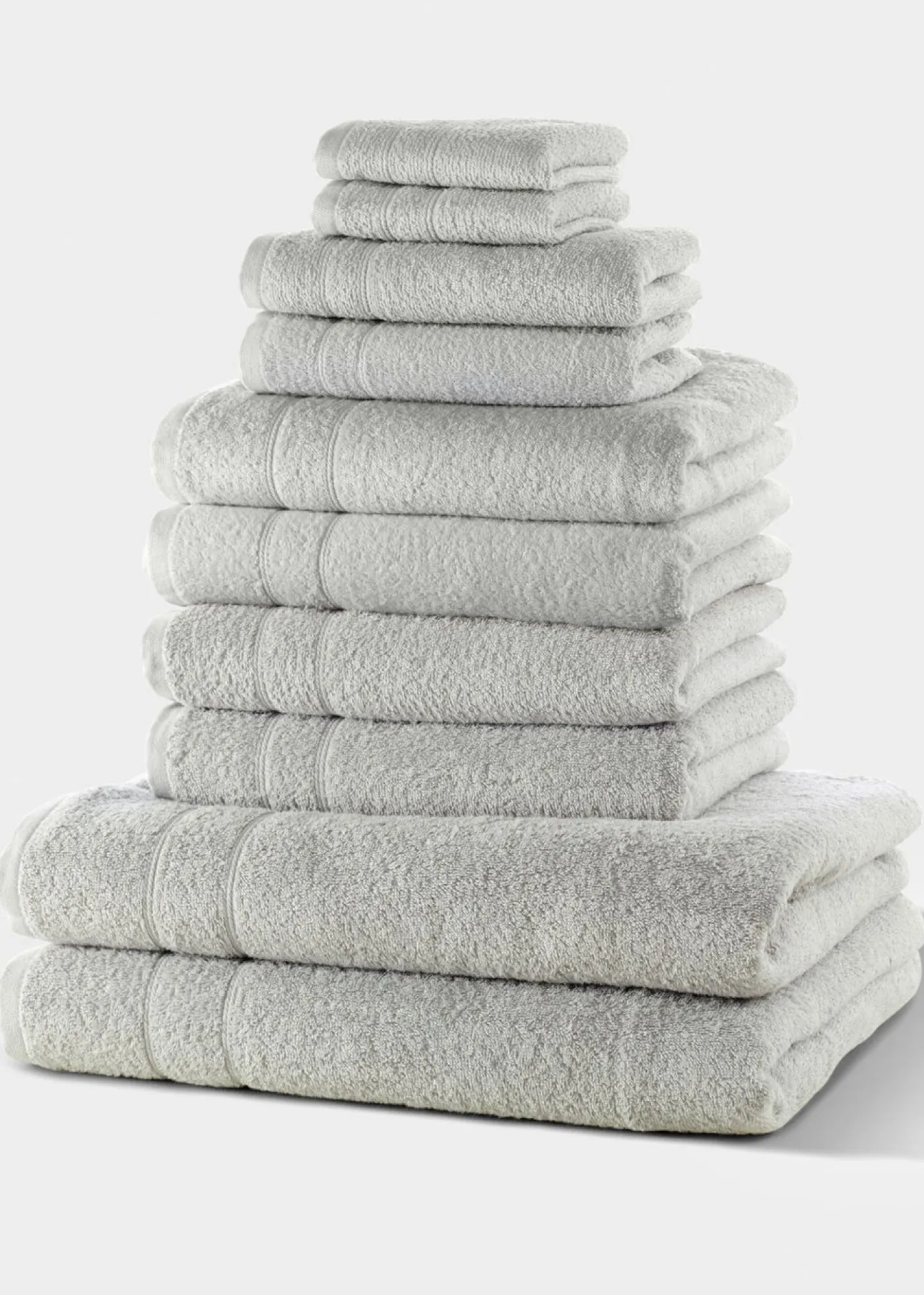Juego de toallas absorbentes (10 piezas) en colores alegres. Suavidad en el baño: ¡te encantará el juego de toallas de 10 piezas! Los colores varían de sutiles a intensos. El uso de algodón puro garantiza una agradable sensación de suavidad en la piel y un buen efecto de secado. El juego incluye 2 paños (de 30/30 cm cada uno), 2 toallas para invitados (de 30/50 cm cada una), 4 toallas de mano (de 50/100 cm cada una) y 2 toallas de ducha (de 70/140 cm cada una). La hora del baño será un placer.