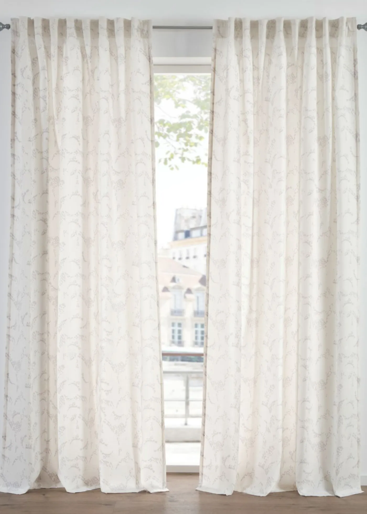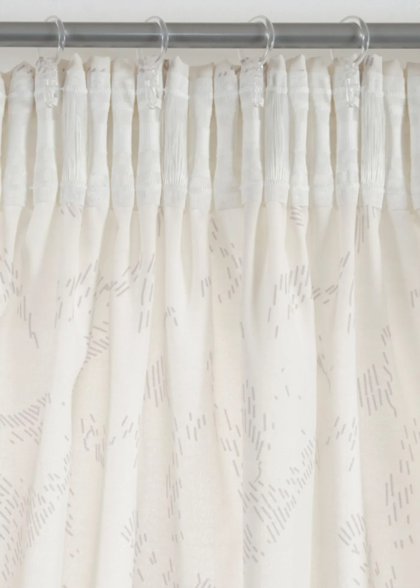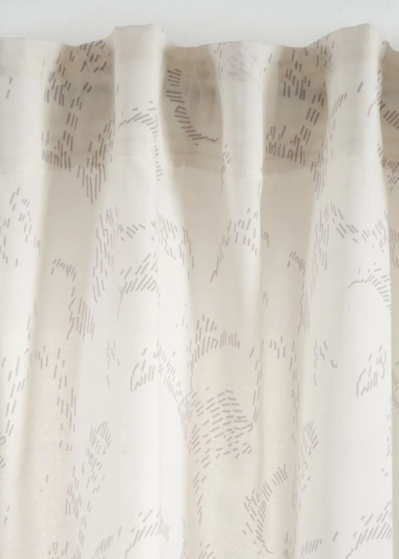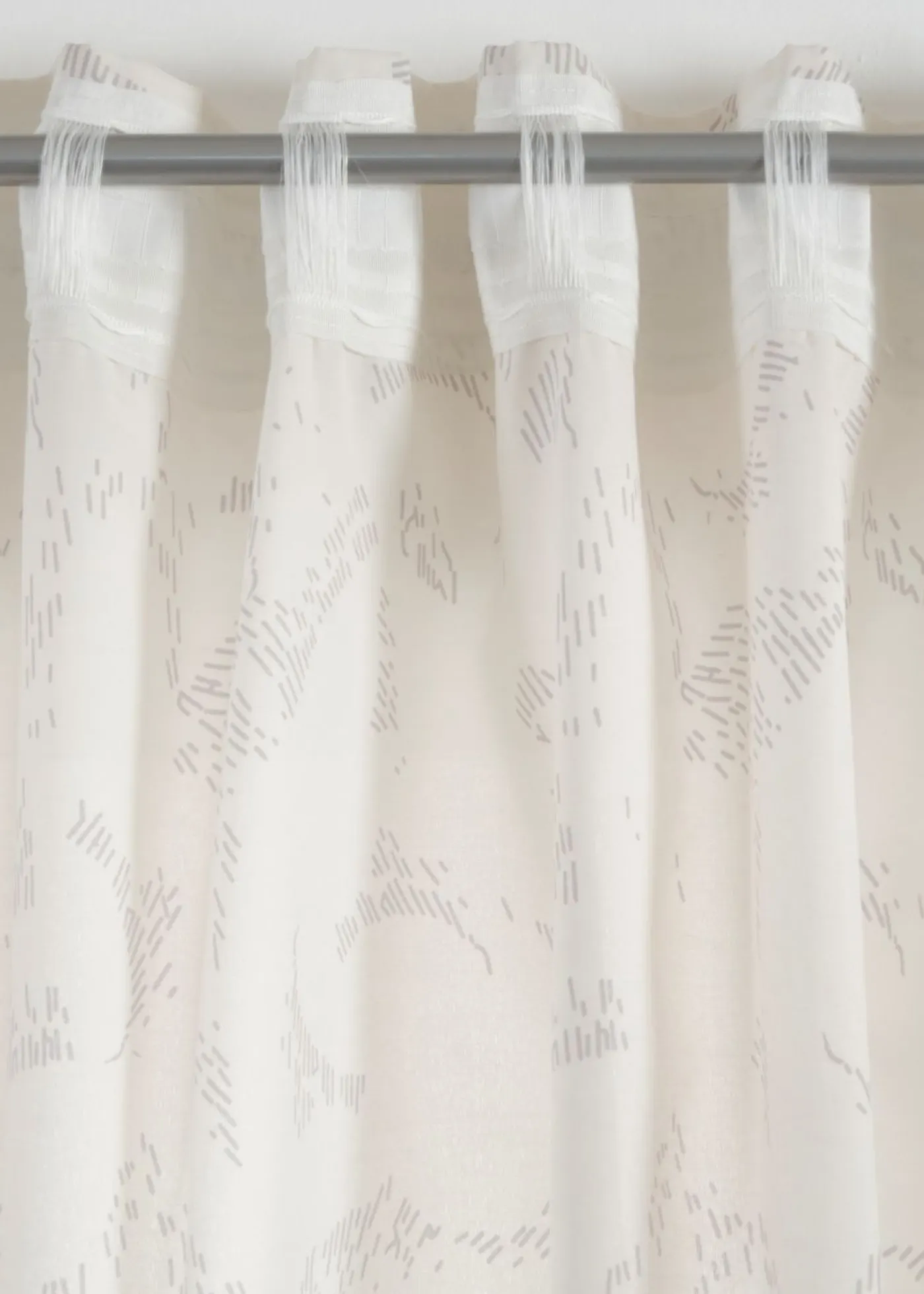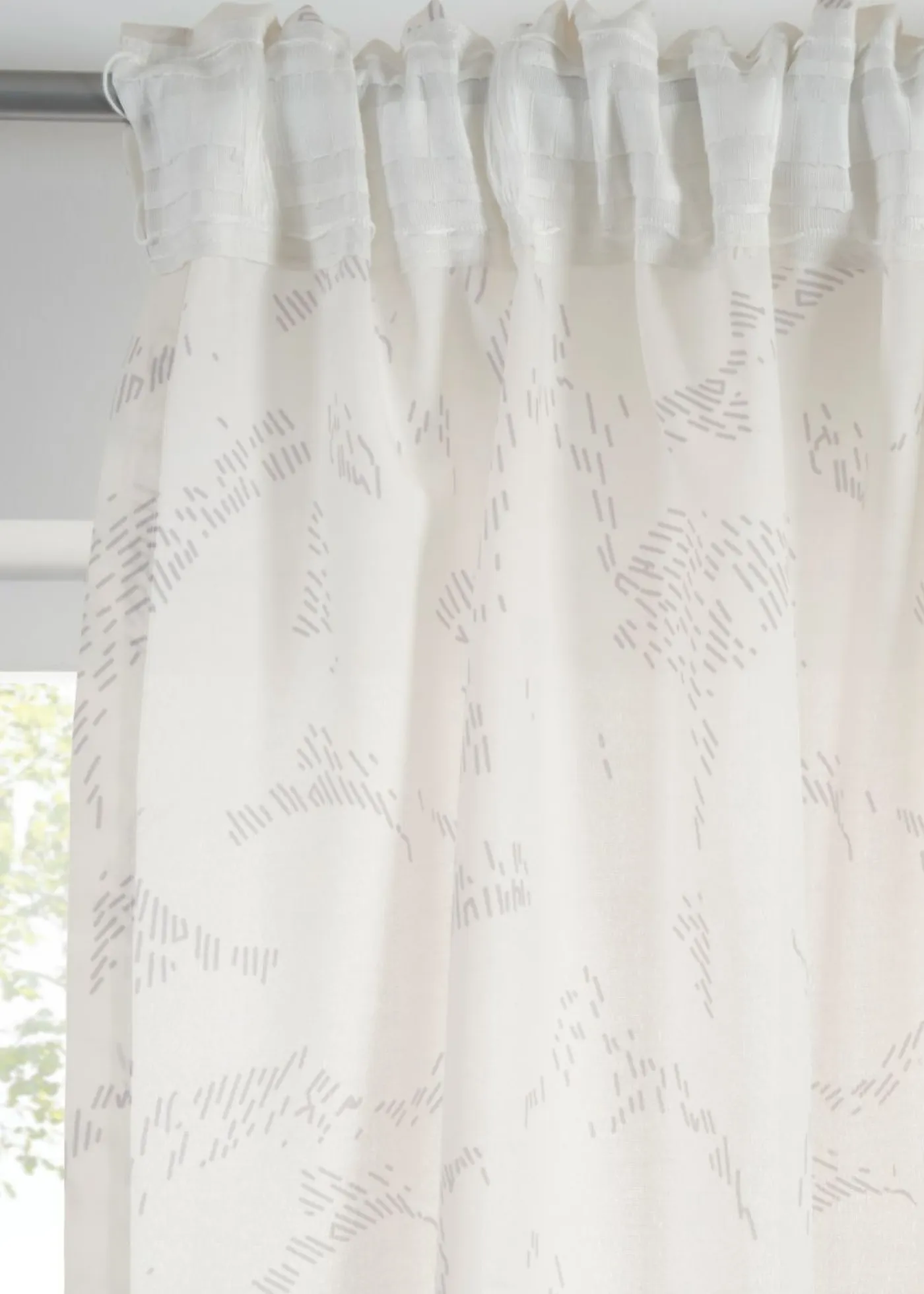 Cortina también disponible en largo extra. Esta cortina presenta un discreto estampado, por lo que les añade un aspecto moderno a las ventanas. Semitransparente y disponible en largo extra.