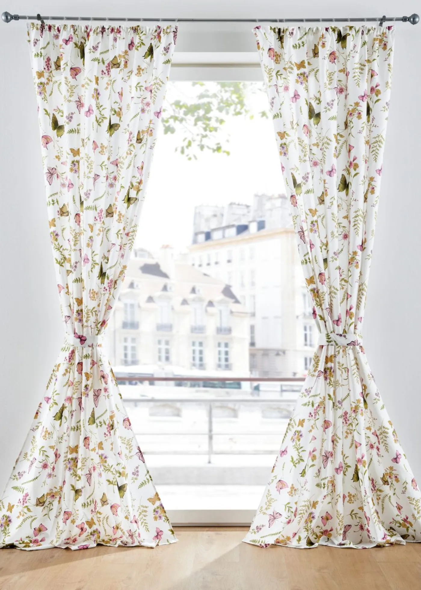Colorida cortina de microfibra. La cortina evoca la primavera en la ventana. No solo destaca por sus colores brillantes, sino también por su diseño moderno y fresco con motivos de mariposas y flores. La cortina opaca se ha confeccionado con microfibra de calidad, por lo que logra una caída elegante y permite que entre la luz de forma moderada. La cortina se entrega con un alzapaños a juego.