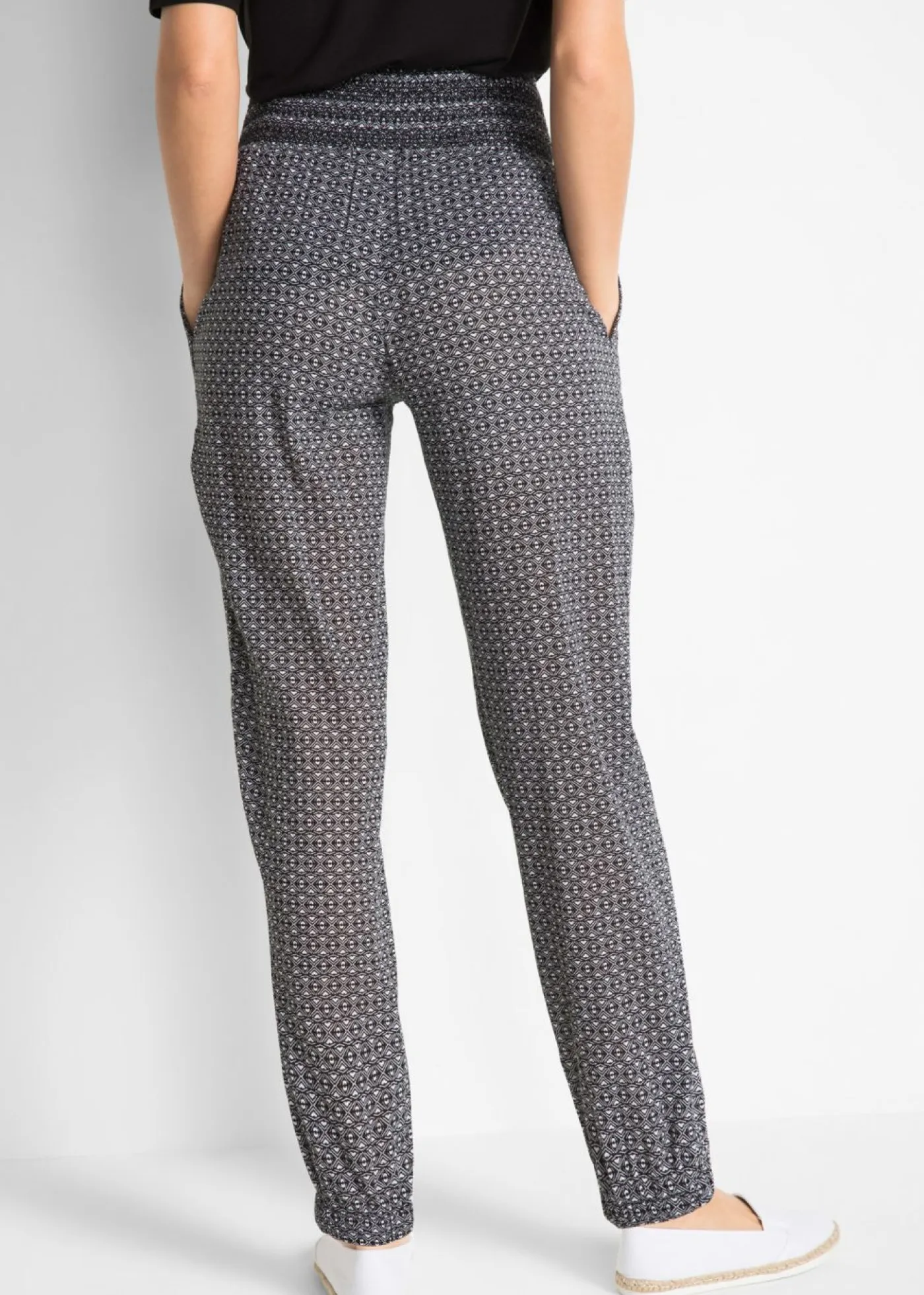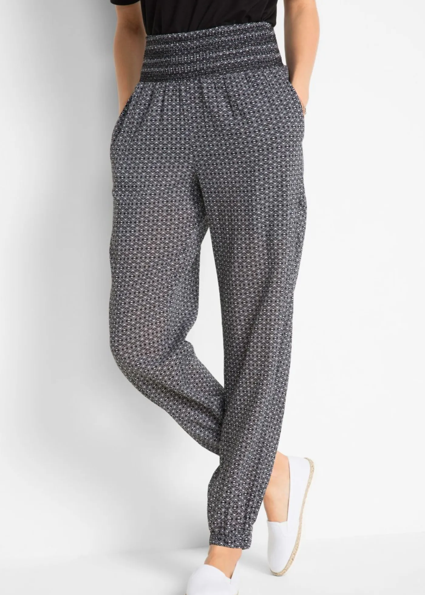 Pantalón bombacho de cuadros con cinturilla elástica. El pantalón holgado con cintura ancha de algodón tejido de alta calidad de la marca bpc destaca por su gran comodidad y disimula las formas redondeadas de los muslos. Gracias a la goma elástica de la cintura y a los puños flexibles de las piernas, el pantalón queda genial y ofrece suficiente libertad de movimiento. El tejido arrugado y los bolsillos le aportan al modelo su aspecto desenfadado y favorecedor.Si lo combinas con una camiseta de ganchillo tendrás el look ideal para todos los días. Largo interior de la pierna de aprox. 79 cm en talla 42. Se puede lavar a máquina.