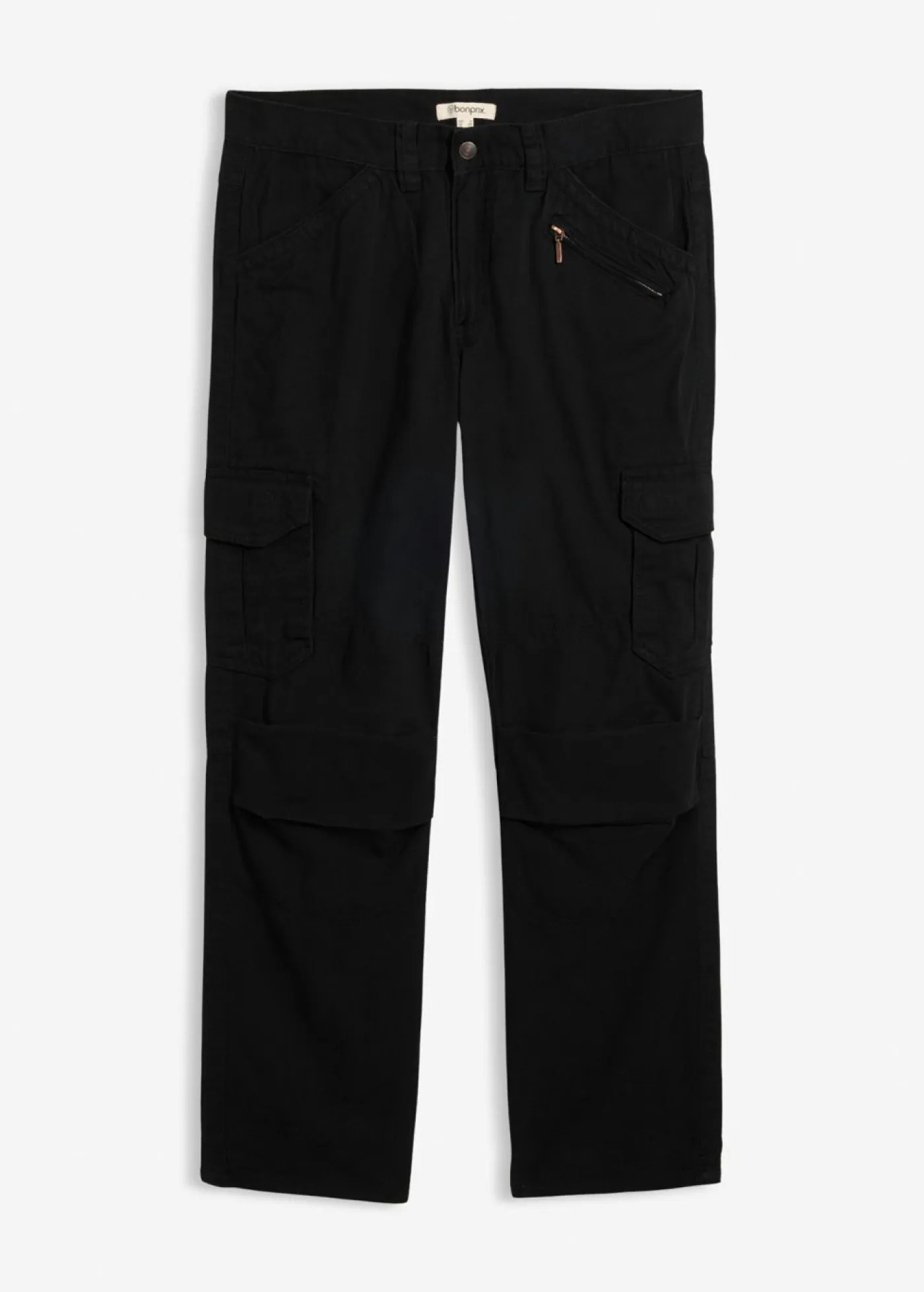 Pantalón tipo cargo con detalle de cremallera y llamativas pinzas en las rodillas. Con pinzas en las rodillas y numerosos bolsillos.