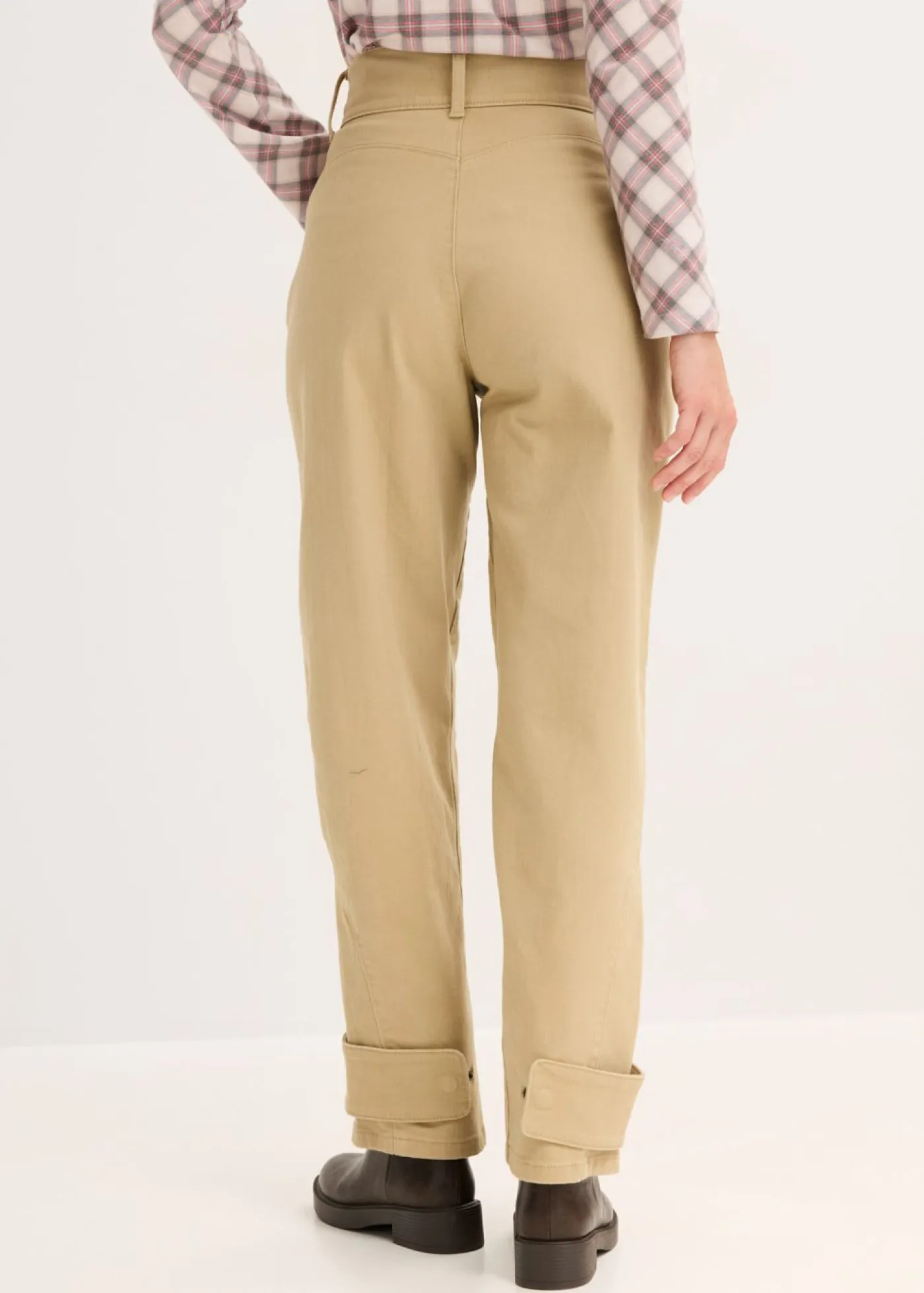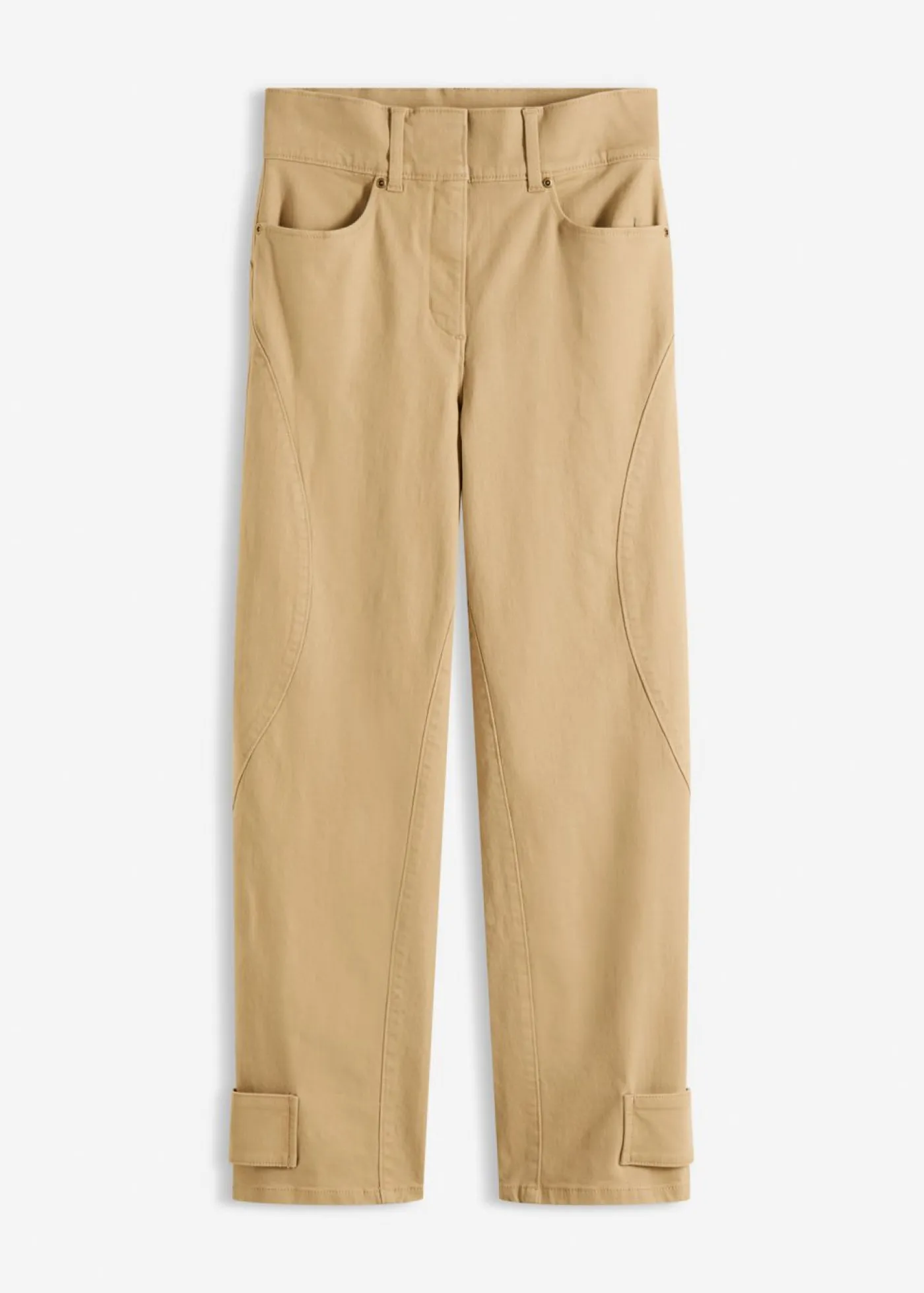 Pantalón de sarga con cintura alta, corte barrel y cierre de botón en el dobladillo.