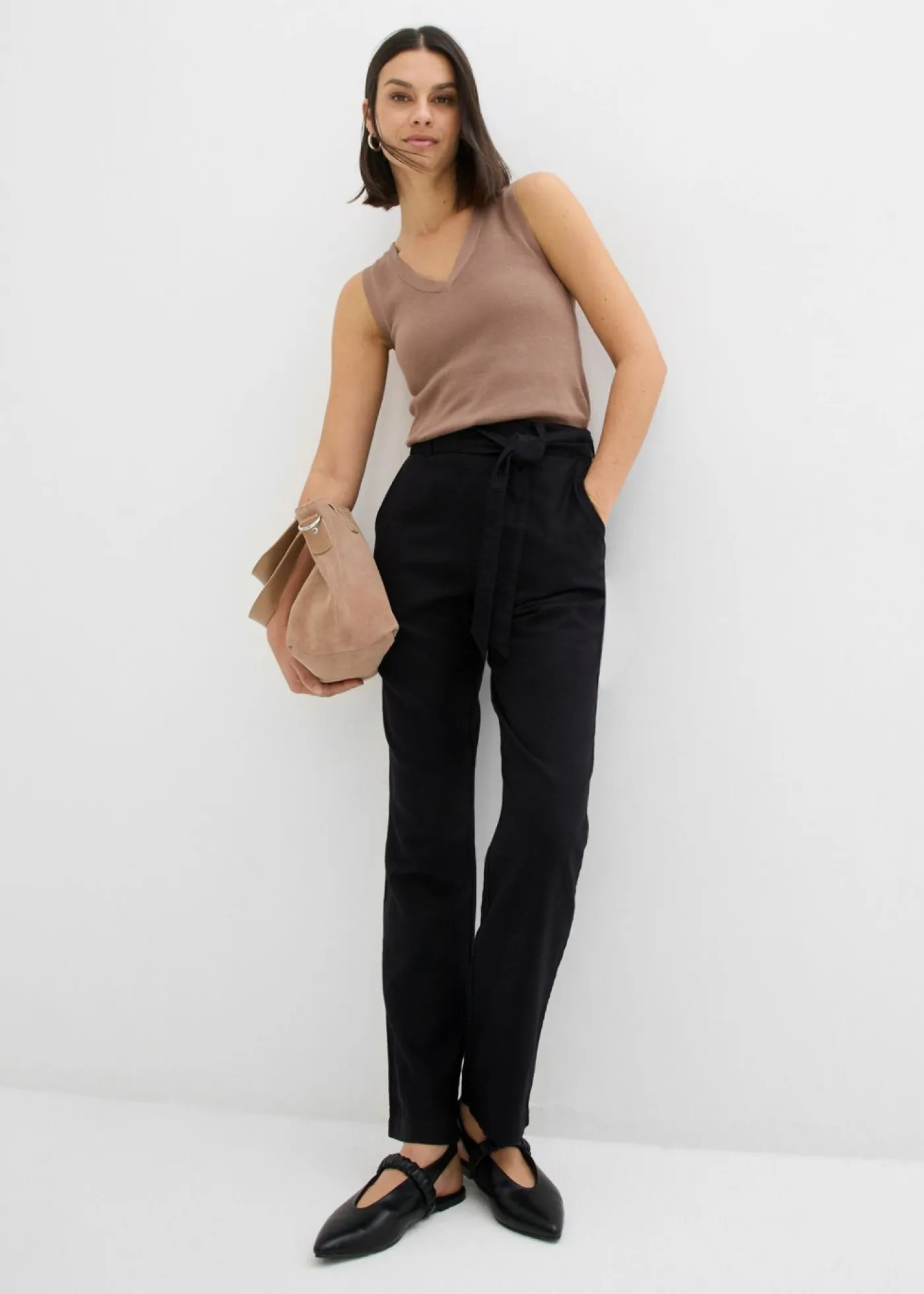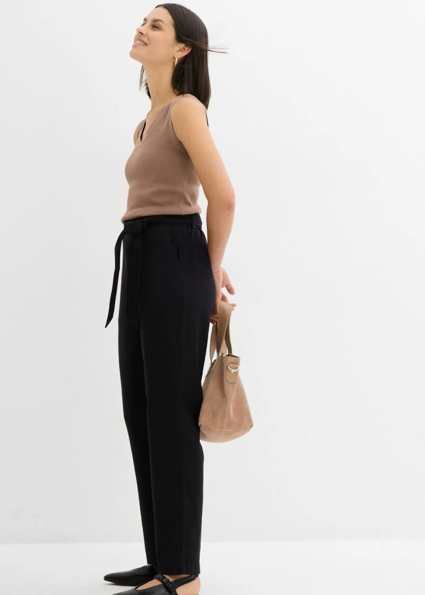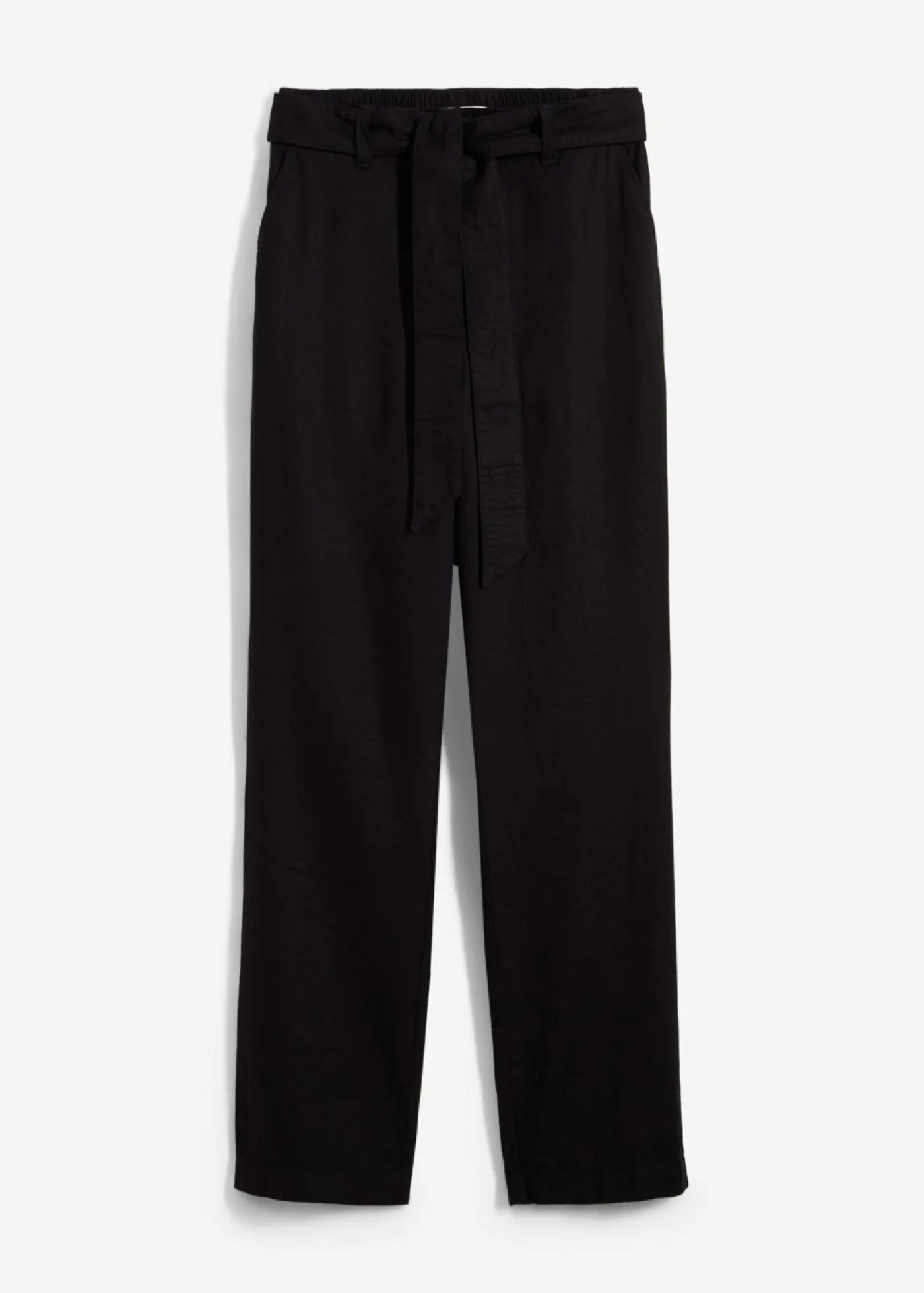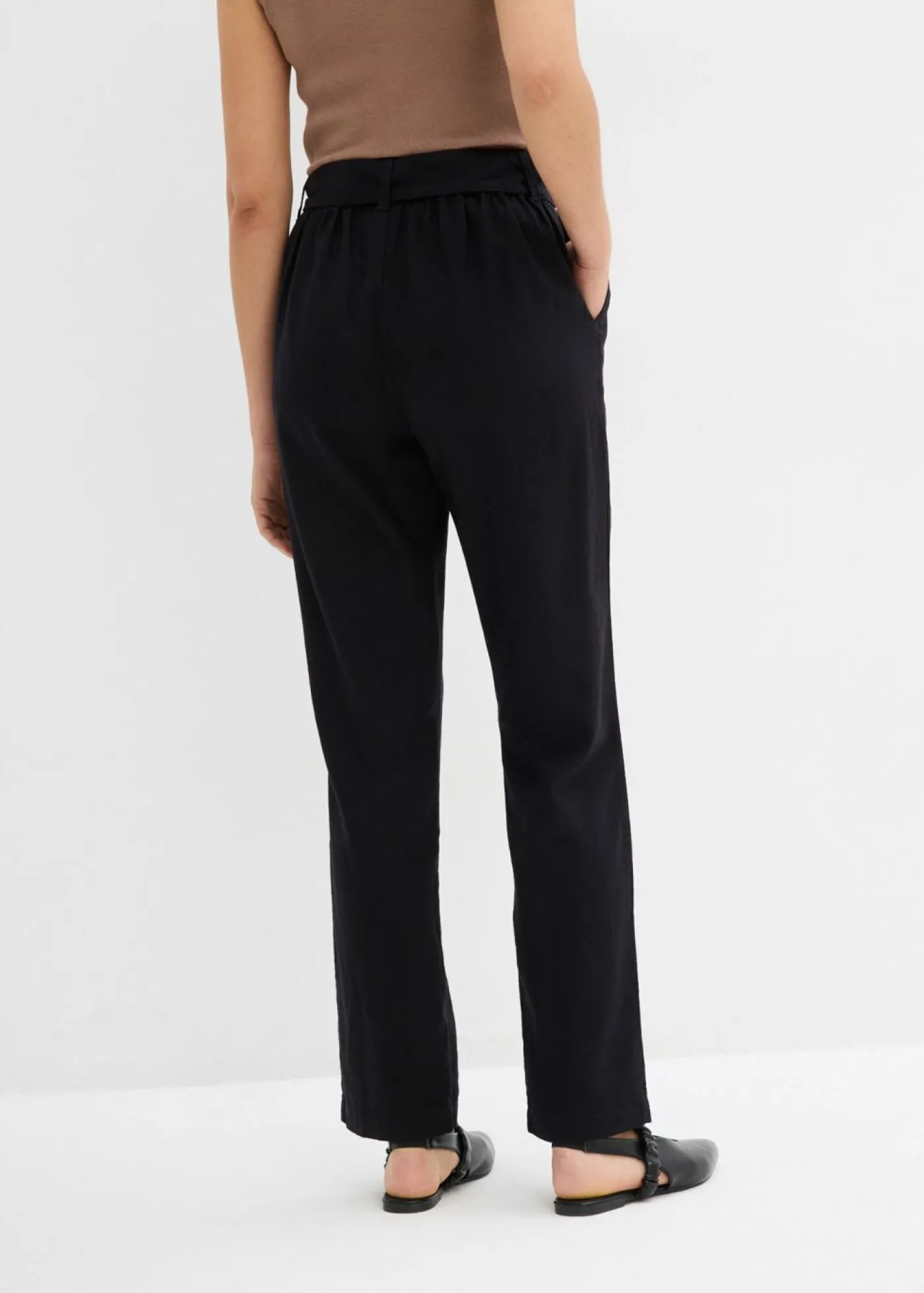Pantalón de mezcla vaporosa de lino y viscosa con dos bolsillos en la parte delantera. La cinturilla se adapta con total flexibilidad. Con el cinturón adecuado. Largo interior de la pierna de aprox. 74,5 cm en talla 42. Se puede lavar a máquina.