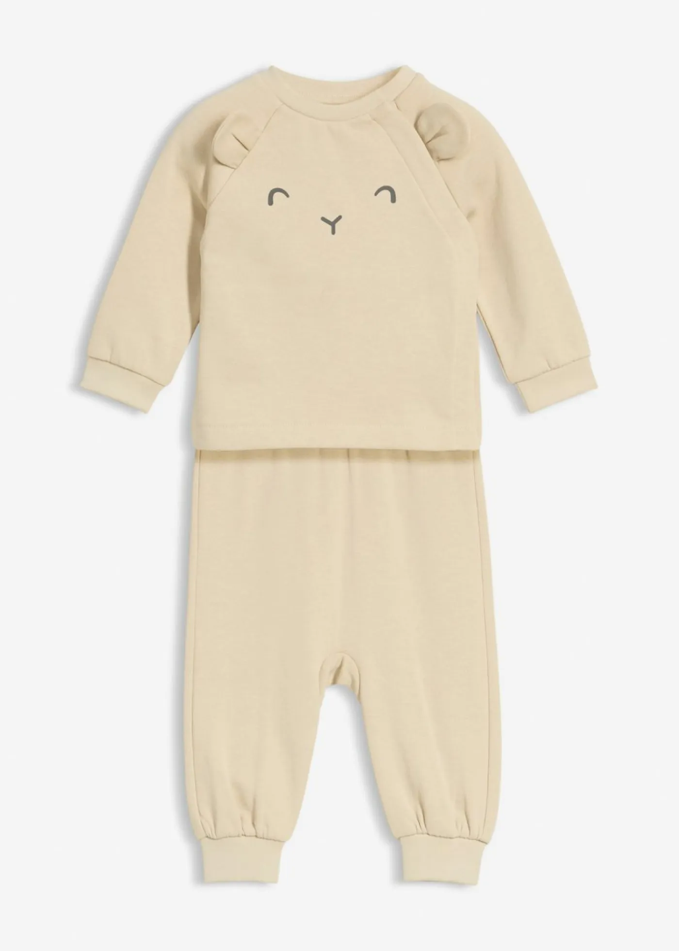 Cómodo conjunto de sudadera y pantalón para bebé con orejitas. Práctico conjunto de sudadera suave con pantalón a juego, confeccionado en mezcla de algodón ligero. La sudadera tiene cuello redondo y mangas raglán con puños suaves. Una tapeta oculta en las mangas raglán permite ponérselas y quitárselas cómodamente tanto para la madre como para el bebé. Las orejas pequeñas y dulces le dan al conjunto un aspecto divertido. El pantalón convence con una cintura envolvente ancha y cómoda y puños ceñidos en el dobladillo para un ajuste óptimo y una gran comodidad de uso. Moderno, cómodo e ideal para el uso diario.