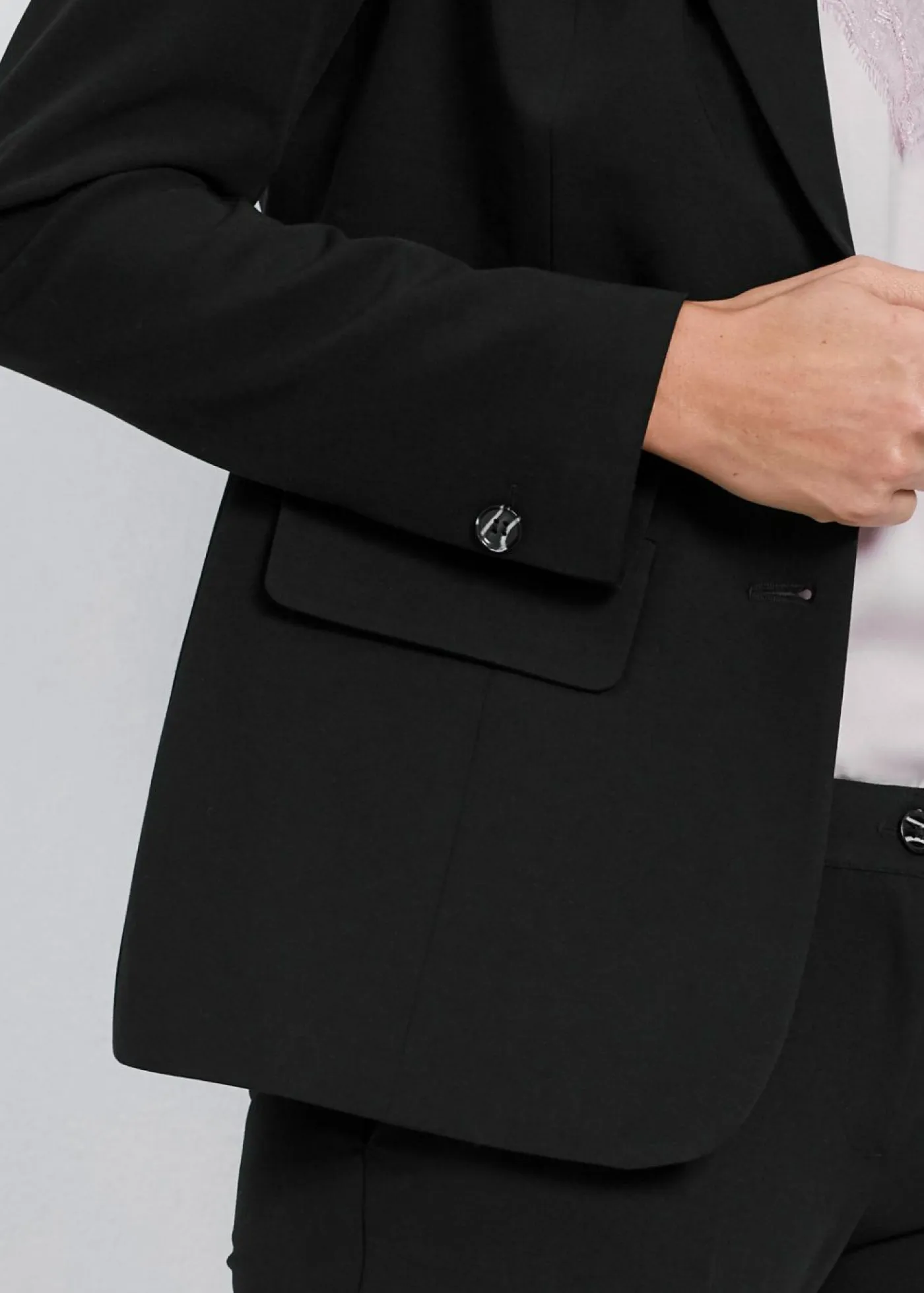 Traje de pantalón moderno con parte de viscosa. El elegante traje de pantalón se puede combinar de muchas maneras gracias a su diseño clásico. Los botones en color cuerno centran toda la atención.