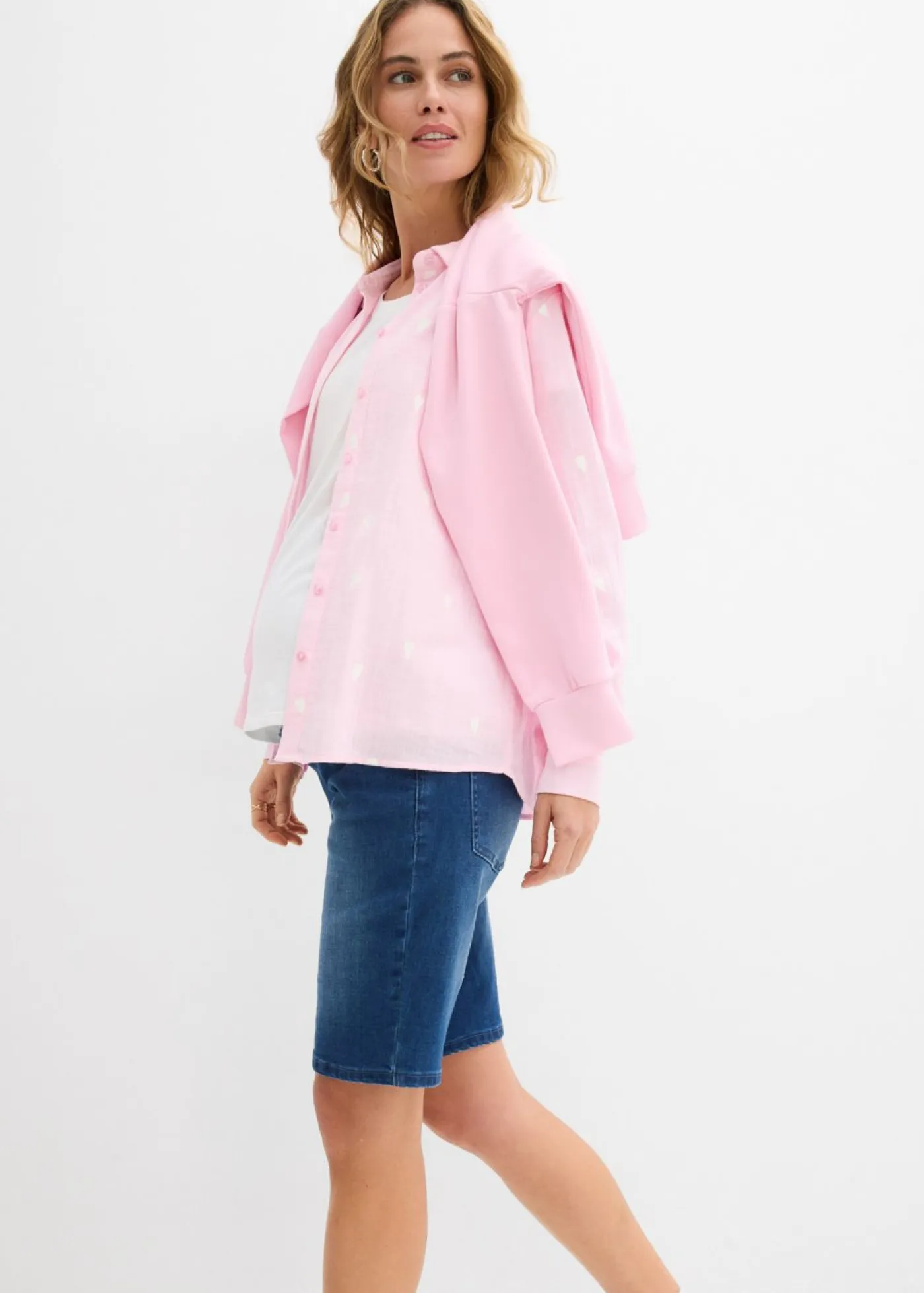 Cómodas bermudas vaqueras premamá. Estas bermudas premamá ajustadas con 5 bolsillos tienen los bolsillos delanteros y traseros habituales. Estos vaqueros premamá con piernas estrechas disponen de una cintura ajustable y de una faja de punto suave y elástica para cubrir la barriga y ofrecer comodidad durante todos meses del embarazo.