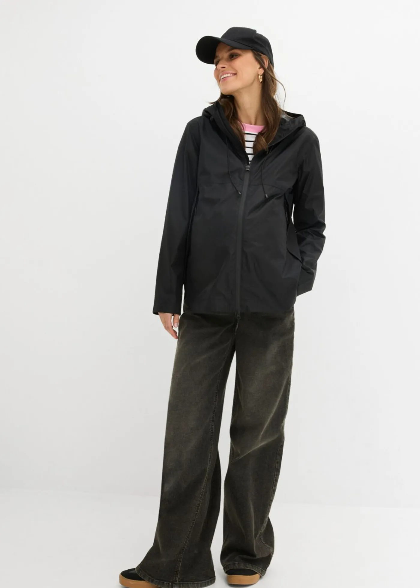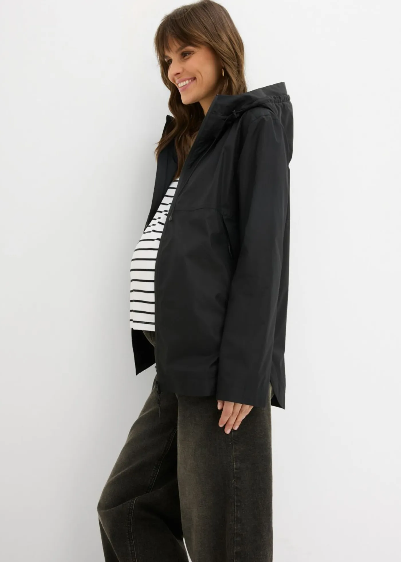 Impermeable funcional con inserto de porteo. La chaqueta premamá ultraligera, resistente al viento y a la lluvia, es la protección perfecta para la madre y el bebé en el caso de condiciones meteorológicas cambiantes. Ofrece protección fiable contra la lluvia y el viento sin resultar pesada. Con una práctica bolsa. El inserto de porteo cuenta con una pequeña capucha. La gran capucha ofrece una protección adicional contra la lluvia gracias a la visera y a la posibilidad de ajuste. Los bolsillos ocultos se pueden cerrar con cremalleras. Gracias al acabado lateral especial, la chaqueta crece con la mujer y puede seguir usándose tras el embarazo. Gracias a la bolsa, la chaqueta se puede guardar fácilmente en el bolso o en el cochecito.