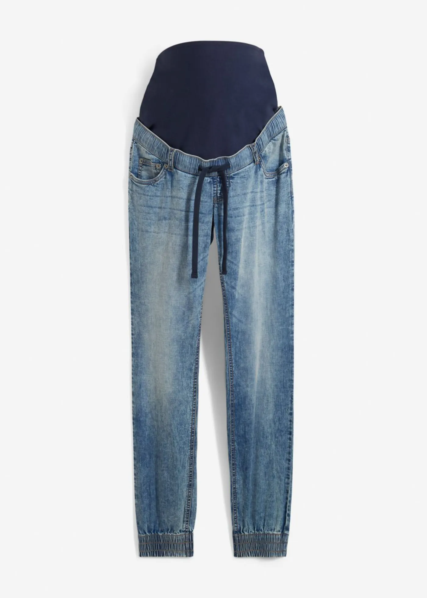 Cómodos joggers vaqueros para el embarazo. Vaqueros de 5 bolsillos de denim de algodón orgánico elástico para un ajuste cómodo. Ajuste cómodo con un cómodo ancho de muslo y pernera estrecha con un suave tejido en el dobladillo. La cinturilla de punto ancha asegura un ajuste óptimo al vientre. Para una mayor comodidad, la cinturilla sin botones cuenta con una goma elástica y cintas ajustables.