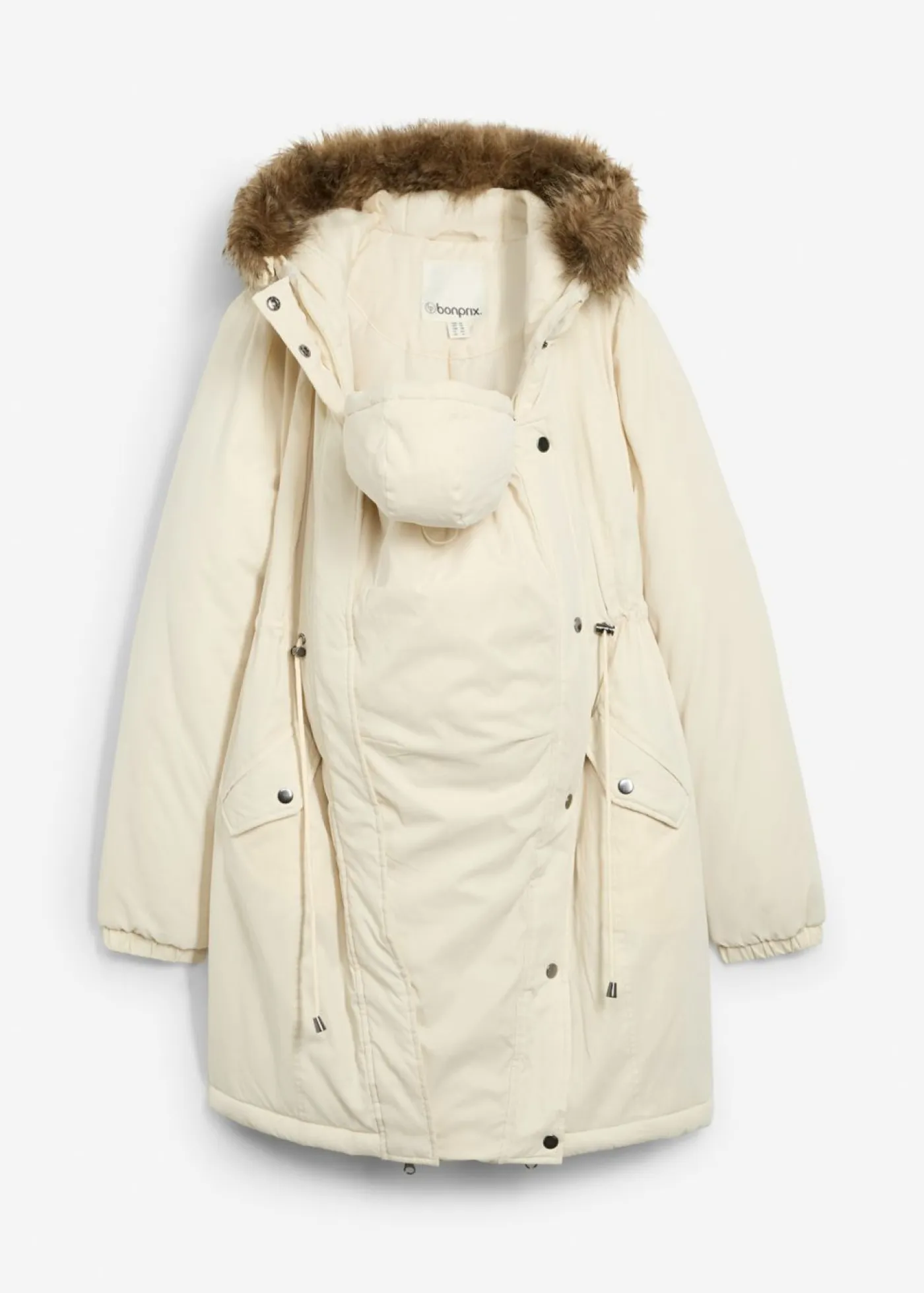Parka premamá con guateado medio para durante y después del embarazo. Las cremalleras laterales ofrecen anchura adicional y permiten llevar la chaqueta incluso después del embarazo. Un inserto de porteo desmontable con capucha protege al bebé del viento y las inclemencias del tiempo. Con cremallera bidireccional, cuello alto con botones automáticos, capucha con piel sintética desmontable. Cordón de ajuste bajo el pecho con topes de cordón. Bolsillos de parche y puños elásticos.
