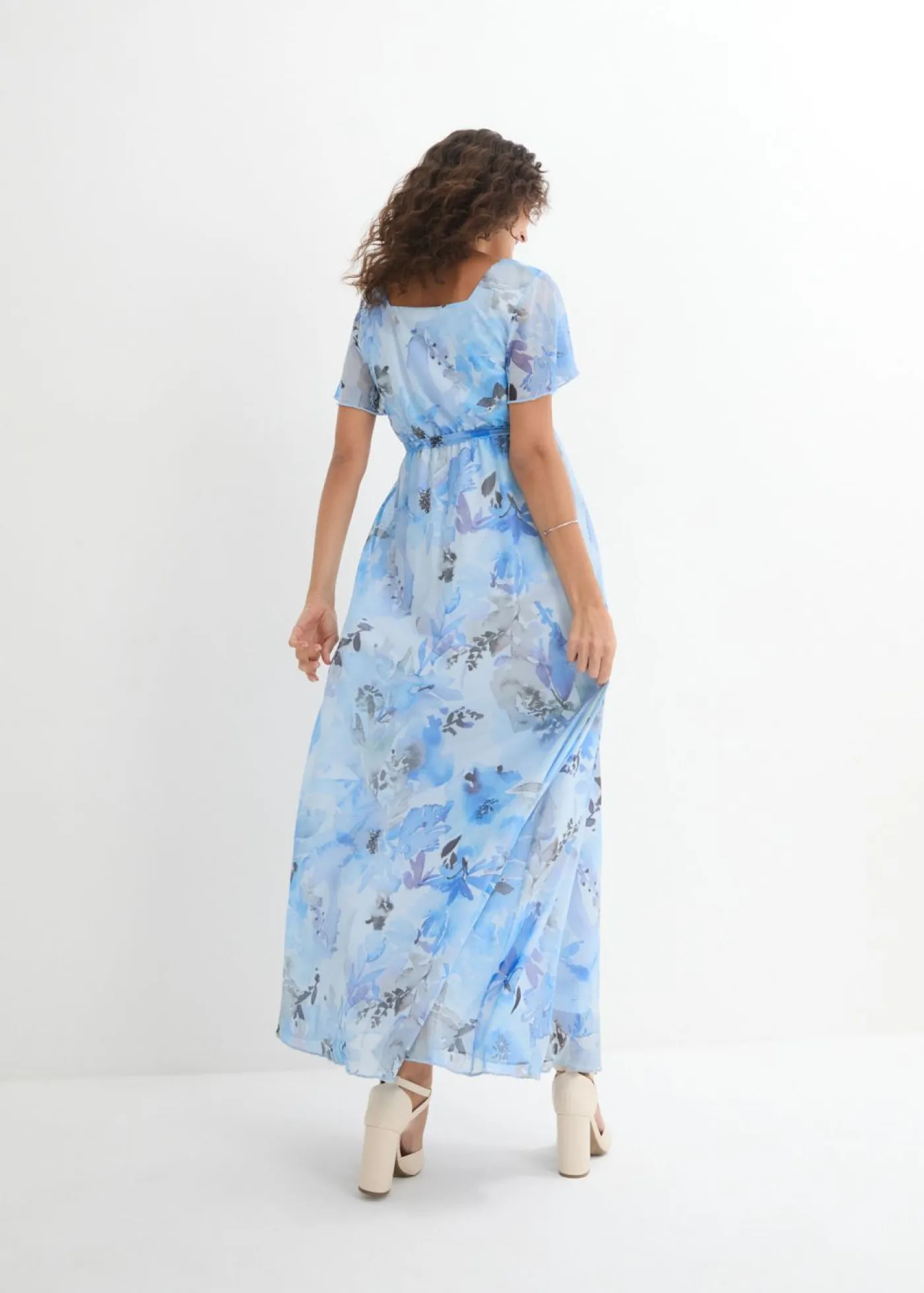 Vestido largo estampado para ocasiones especiales durante el embarazo. Vestido premamá largo de malla elástica con forro suave. Con escote rectangular, delicadas mangas de murciélago y cordón desmontable. La costura elástica debajo del pecho y la falda en ligera línea en A crean una silueta favorecedora y ofrecen una gran comodidad. El delicado aspecto de malla aporta un toque romántico, mientras que el estampado de flores en acuarela aporta una elegancia divertida.