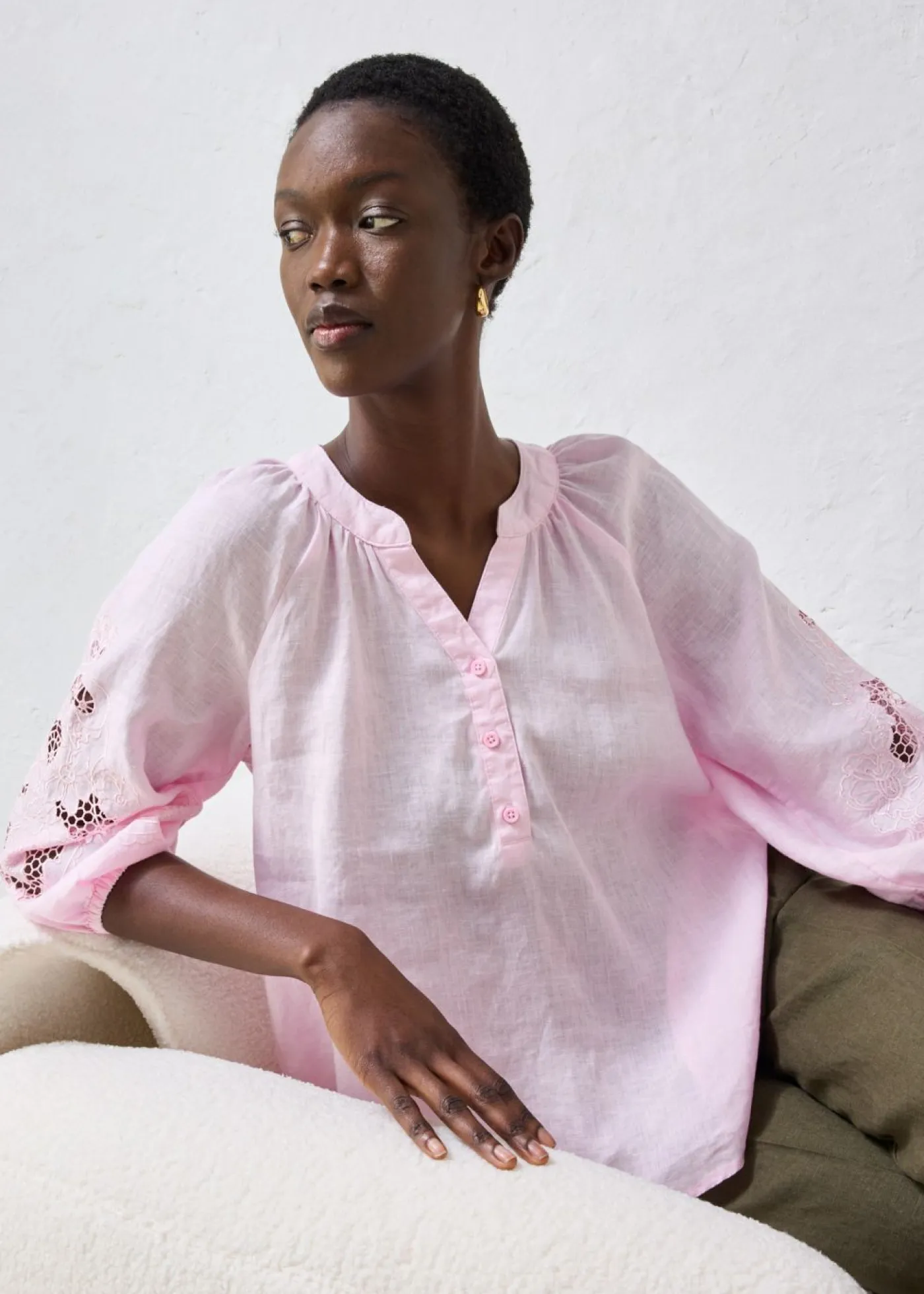Con bordado calado en las mangas 3/4 de lino puro. El lino es una fibra natural resistente y, gracias a sus propiedades fibrosas, transpira la piel. Se caracteriza por los finos pliegues y la superficie estructurada. Agradable y vaporoso, el lino será tu compañero ideal para el verano.