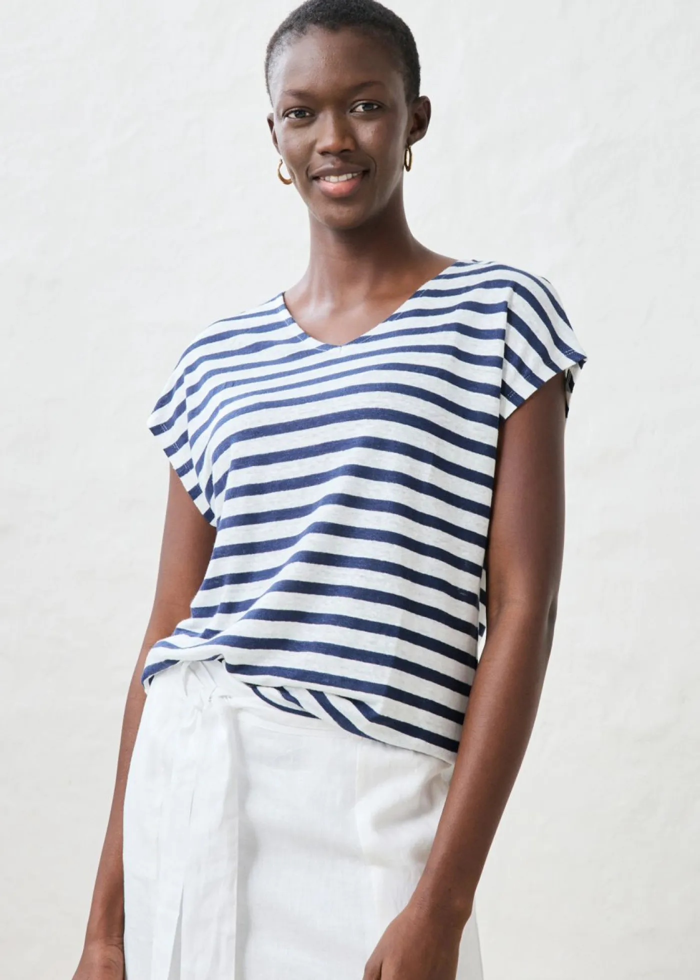 Camiseta de lino con diseño de rayas y escote en V en la parte delantera y trasera. El lino es una fibra natural resistente y, gracias a sus propiedades fibrosas, transpira la piel. Se caracteriza por los finos pliegues y la superficie estructurada. Agradable y vaporoso, el lino será tu compañero ideal para el verano.
