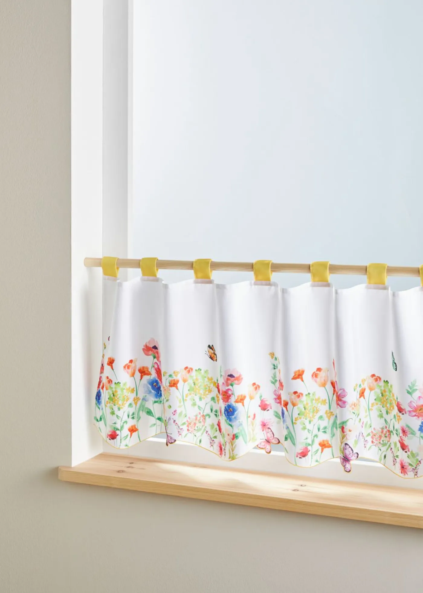 Cortina de cocina con estampado digital primaveral. Esta cortina primaveral aporta alegría a las habitaciones.
