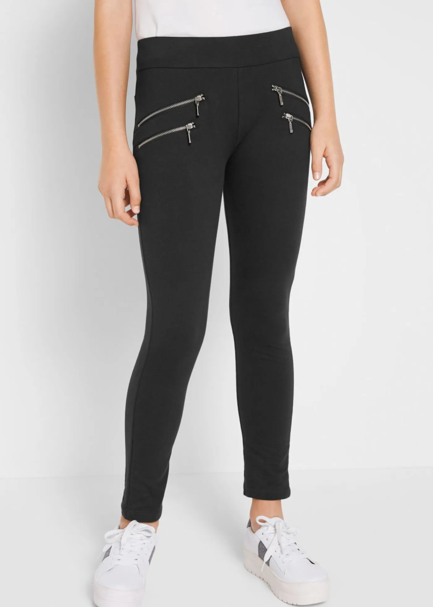 Bonito pantalón de niña con cremallera. Moderno pantalón elástico con cintura elástica y cómodo tejido transpirable que acompaña todos tus movimientos. La cremallera (falso bolsillo) es otro extra destacado para todas las niñas modernas. Estos pantalones se pueden combinar con unas botas chulas y una camiseta estampada.