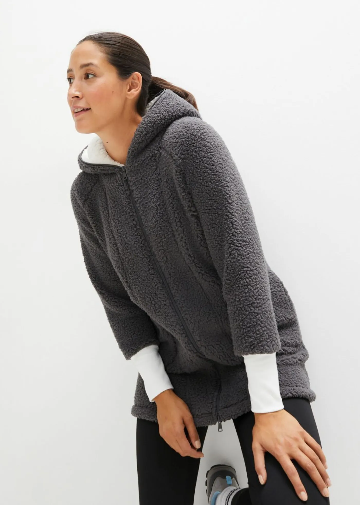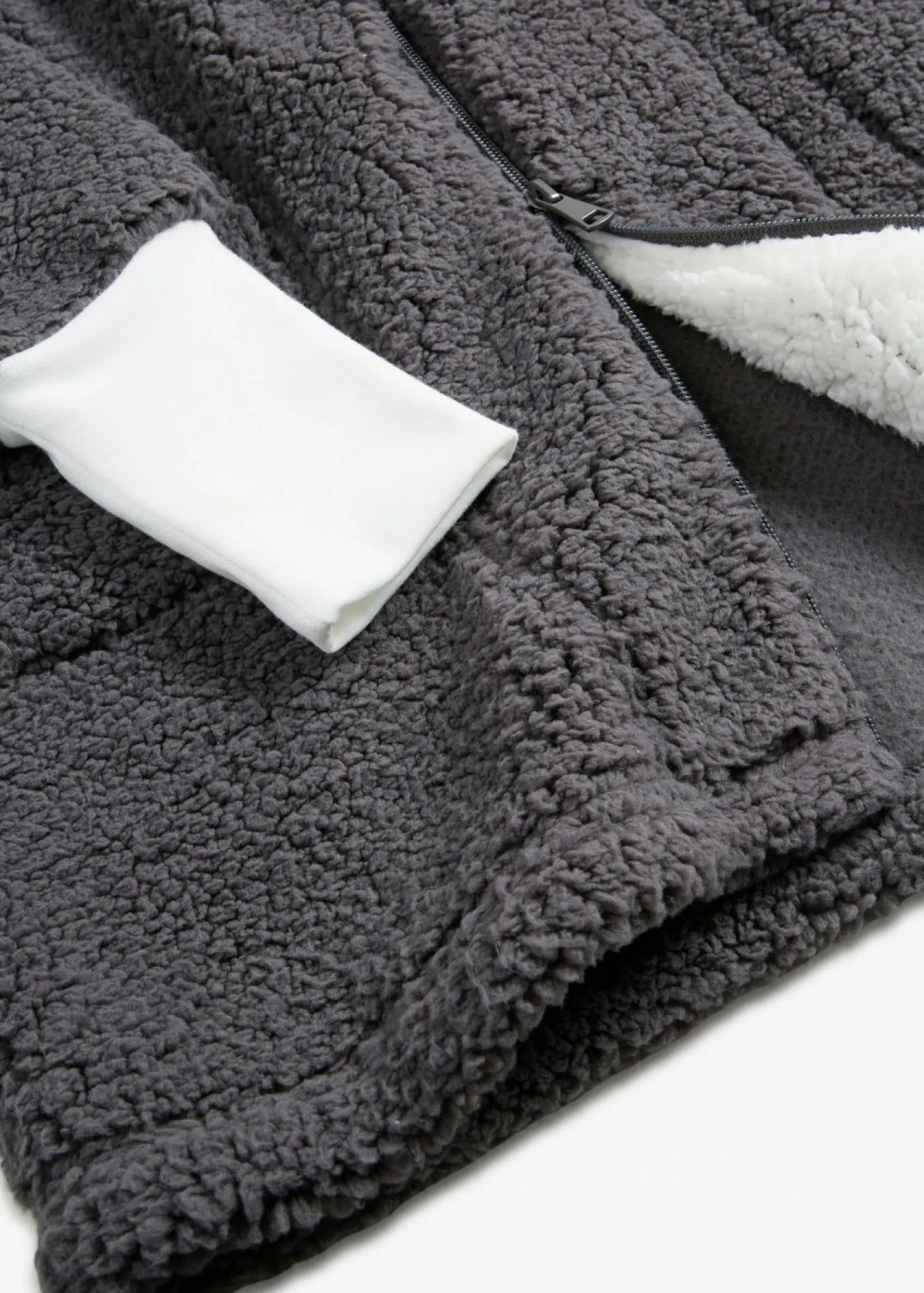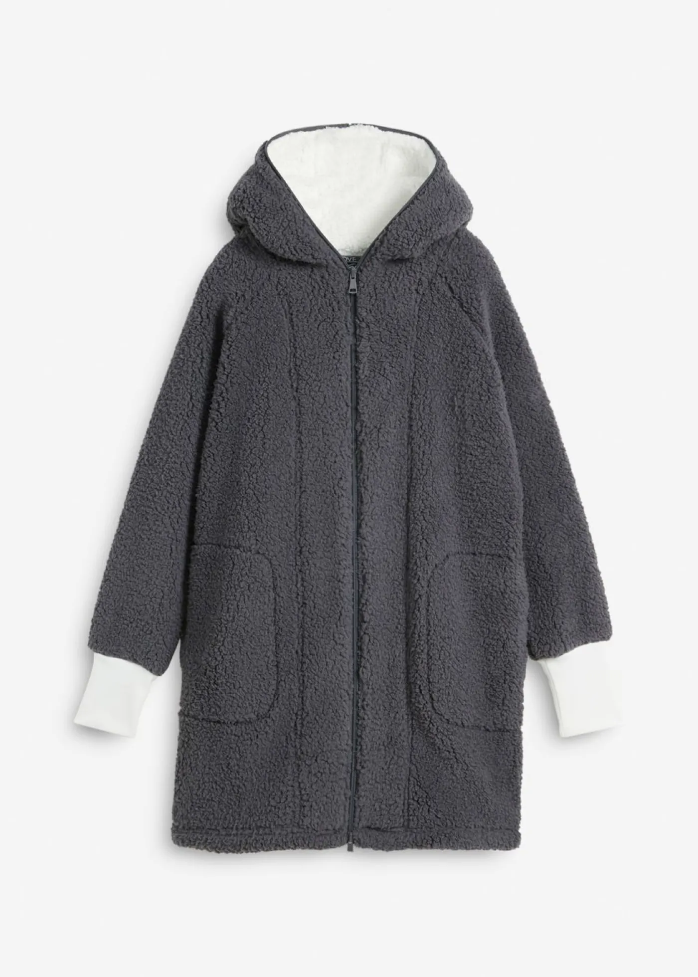 Abrigo polar oversize con bolsillos y cremalleras de doble sentido, que también cierra la capucha. Largo de aprox. 82 cm en talla 40/42. Se puede lavar a máquina.