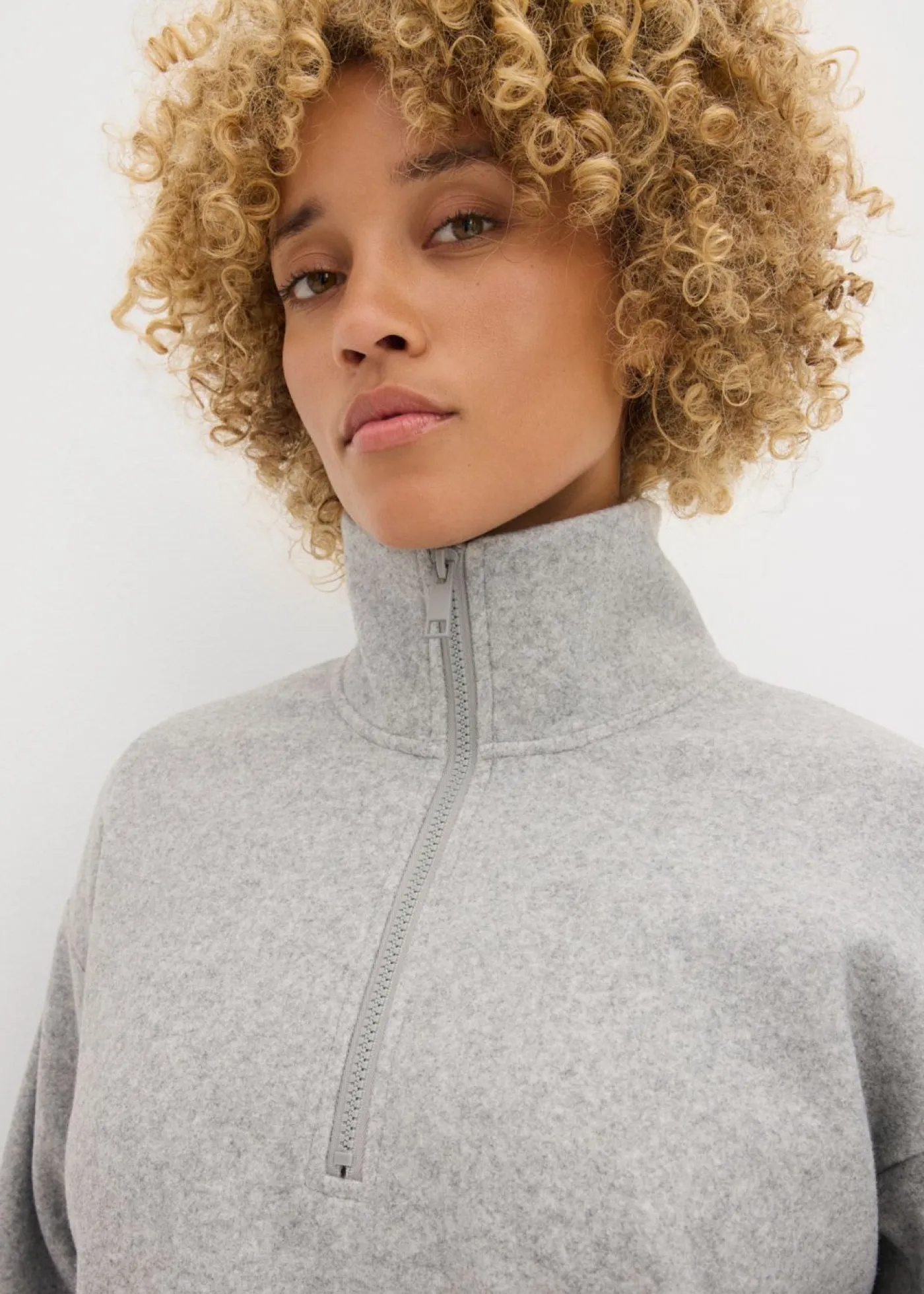 Jersey holgado con cuello alto y cremallera corta. Hombros caídos y bolsillos laterales. Largo de aprox. 74 cm en talla 40/42. Se puede lavar a máquina.
