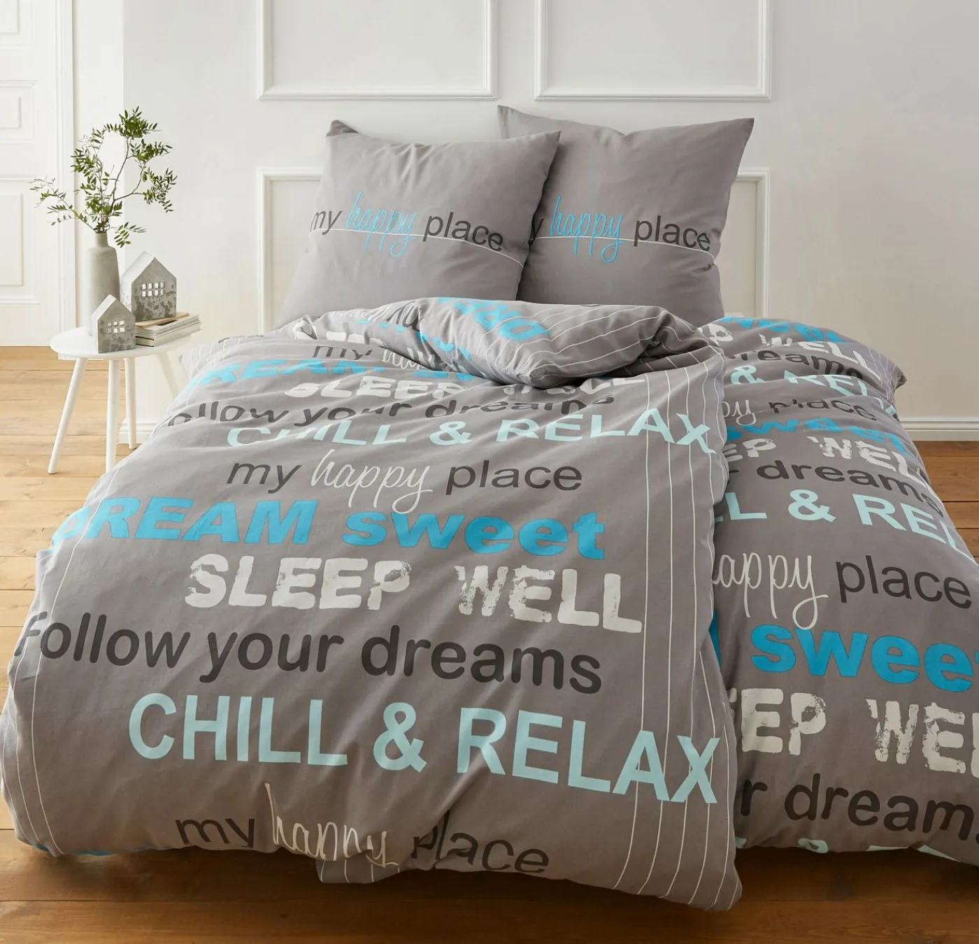 Ropa de cama con texto.
