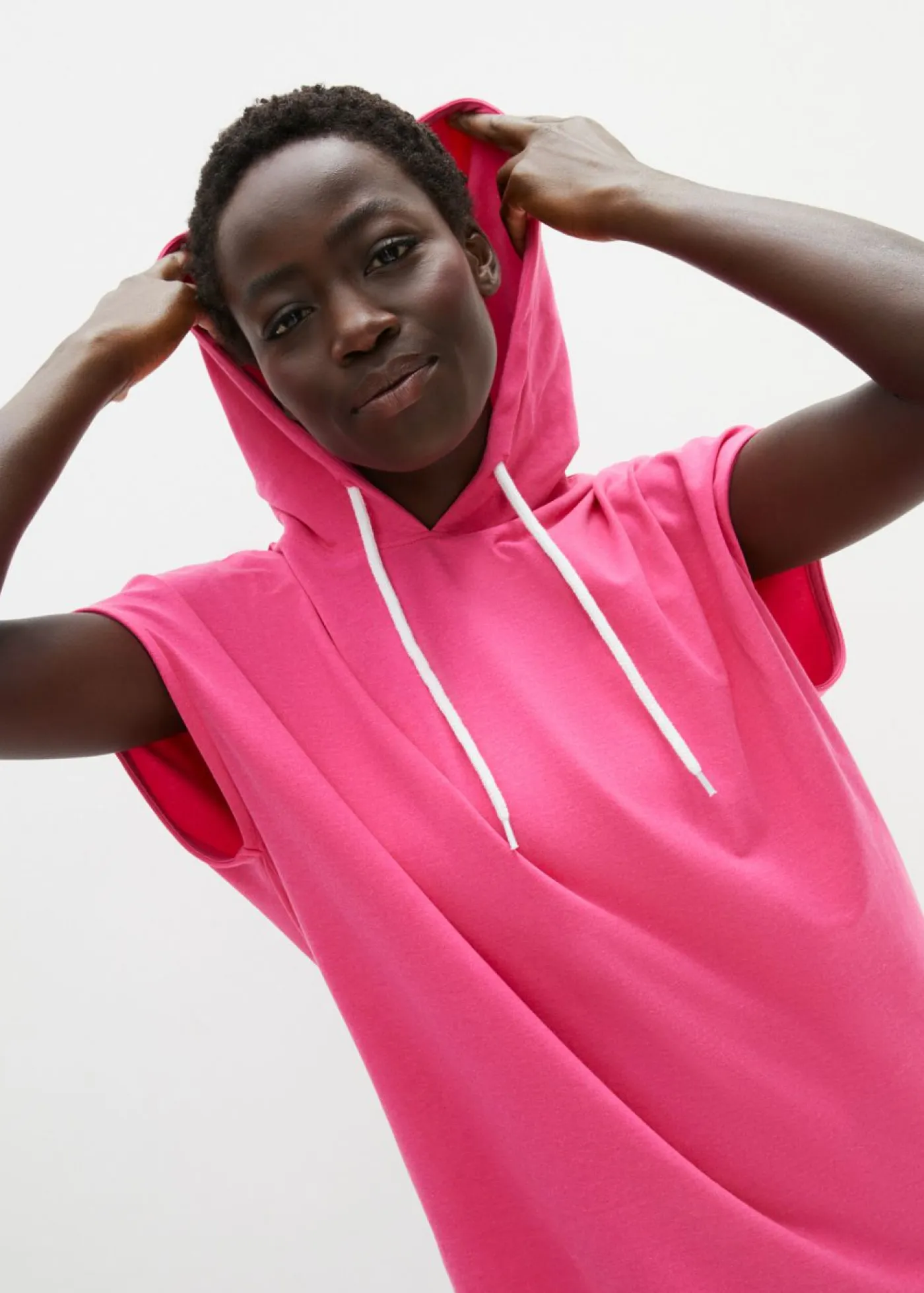 Cómoda sudadera con capucha, mangas cortas y corte ancho. Sin mangas y con capucha. Largo de aprox. 74 cm en talla 40/42. Se puede lavar a máquina.