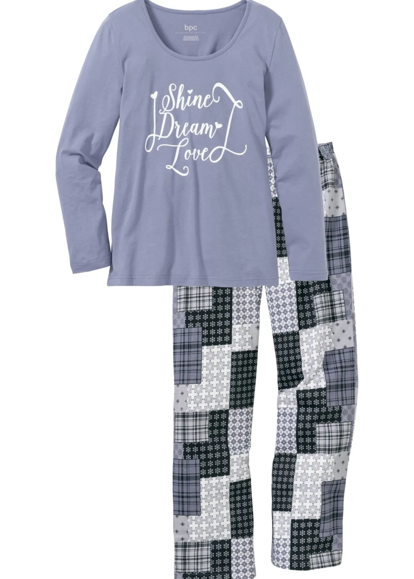 Pijama con toque patchwork. Este pijama de la colección bpc proporciona una excelente sensación de bienestar al dormir o echar una siesta en el sofá. El conjunto consta de dos partes: una camiseta y un pantalón.La parte superior presenta mangas largas y un bonito estampado en la parte delantera. El pantalón de corte recto con estampado de patchwork presenta una cómoda cintura elástica.