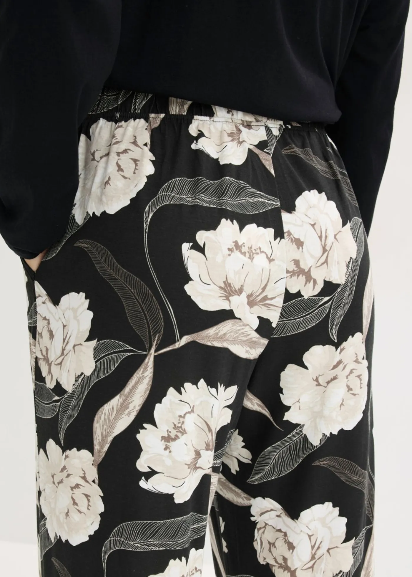 Cómodo pijama compuesto por una camiseta de manga larga y cuello redondo con corte holgado, un pantalón de talle alto con un estampado elegante, bolsillos y perneras anchas.