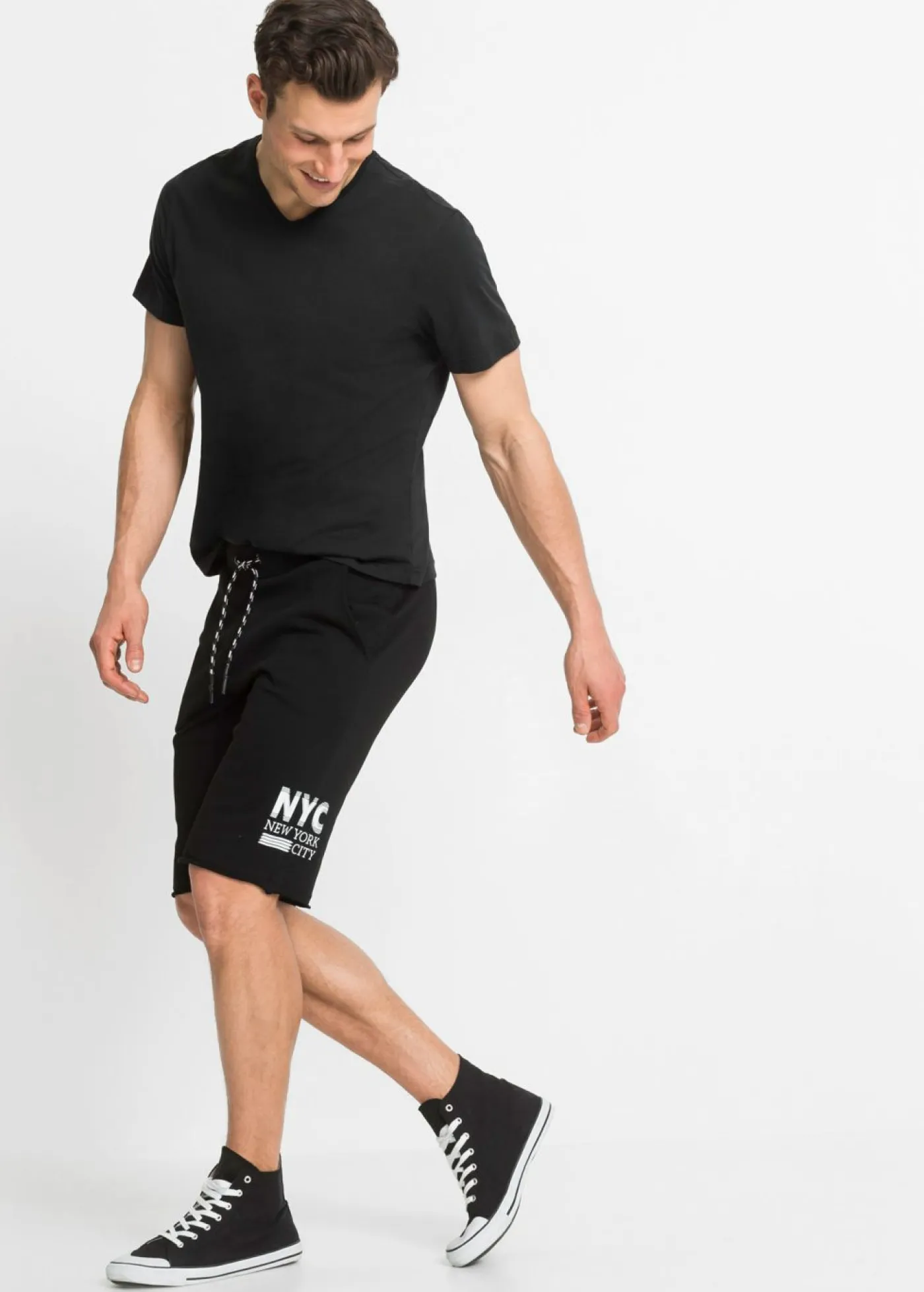 Bermuda de chándal con un pequeño estampado y bordes abiertos en la pernera. Con cordón.