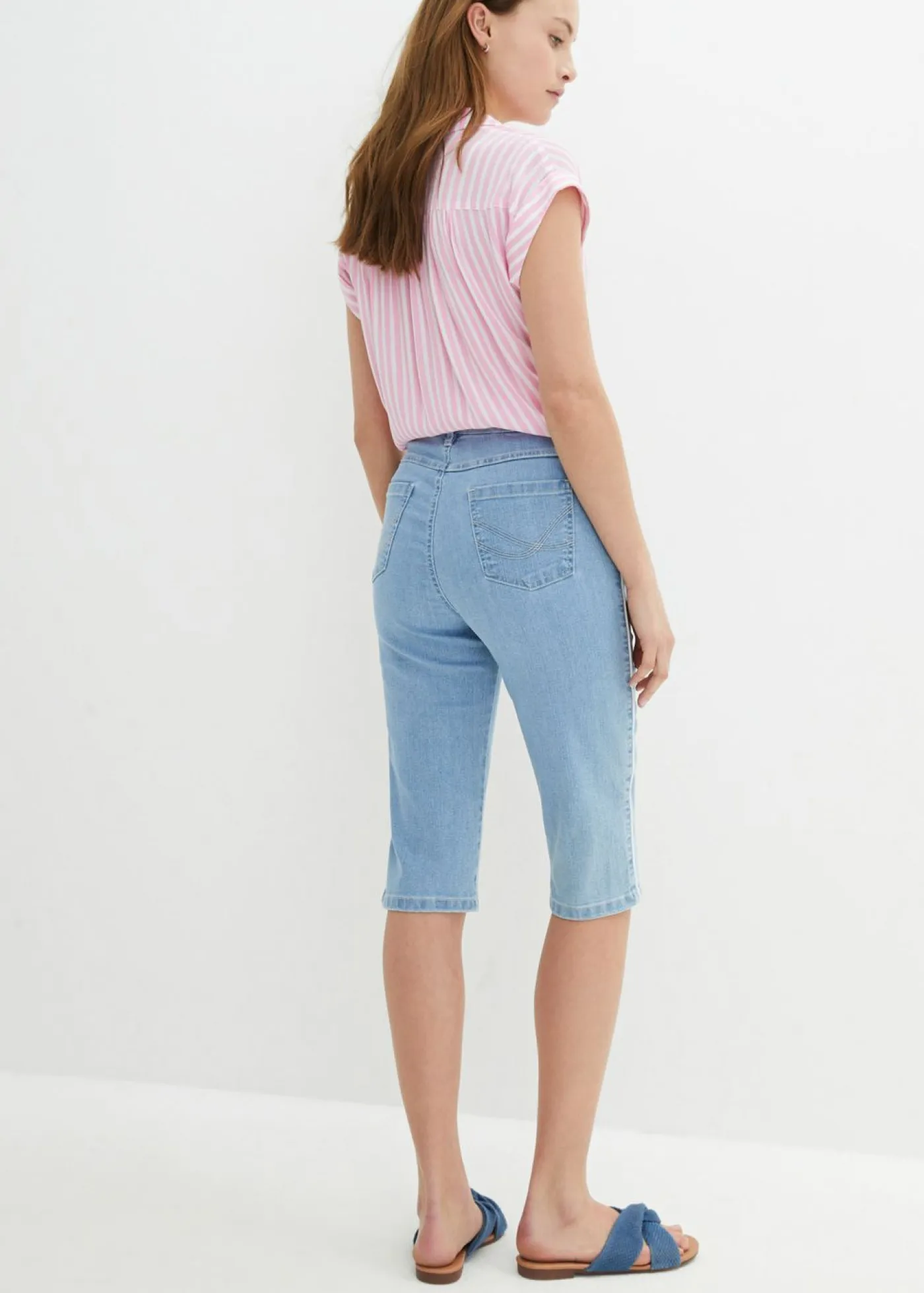 Bermudas vaqueras y estrechas con elástico y rayas laterales. Largo interior de la pierna de aprox. 40,5 cm en talla 42. Se puede lavar a máquina.