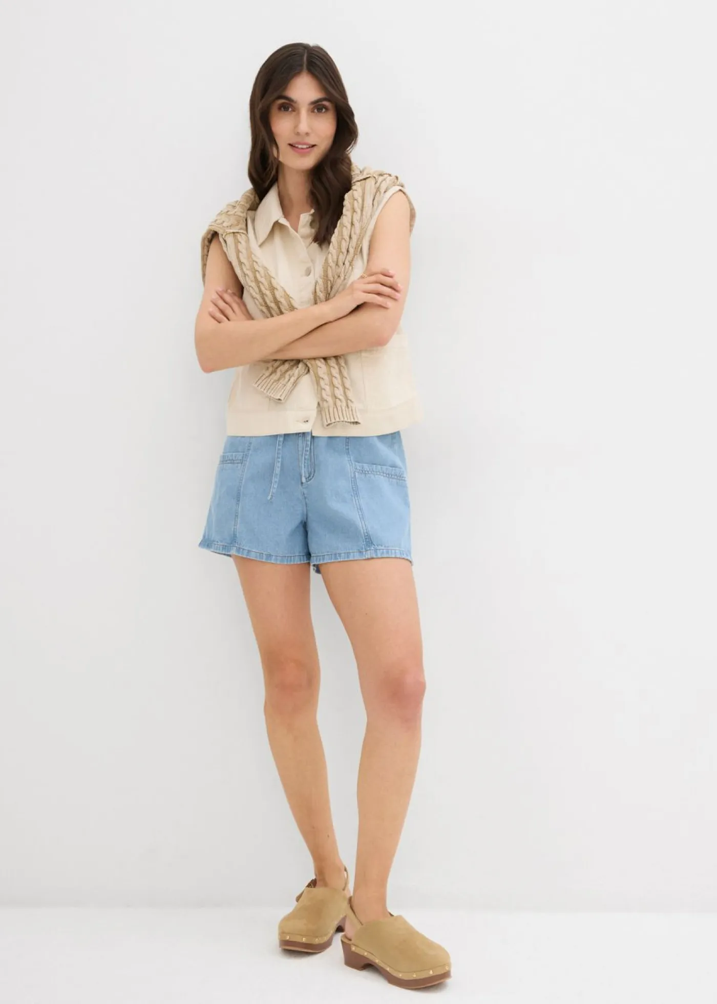 Vaqueros cortos anchos con cinturilla elástica. Vaqueros cortos holgados de 5 bolsillos con cintura elástica de cuentas, confeccionados en un tejido vaquero de algodón firme que al principio resulta un poco rígido, pero que se vuelve más suave y suelto con el uso frecuente. Cintura de talle alto. Largo interior de la pierna de aprox. 10,5 cm en talla 42. Se puede lavar a máquina.