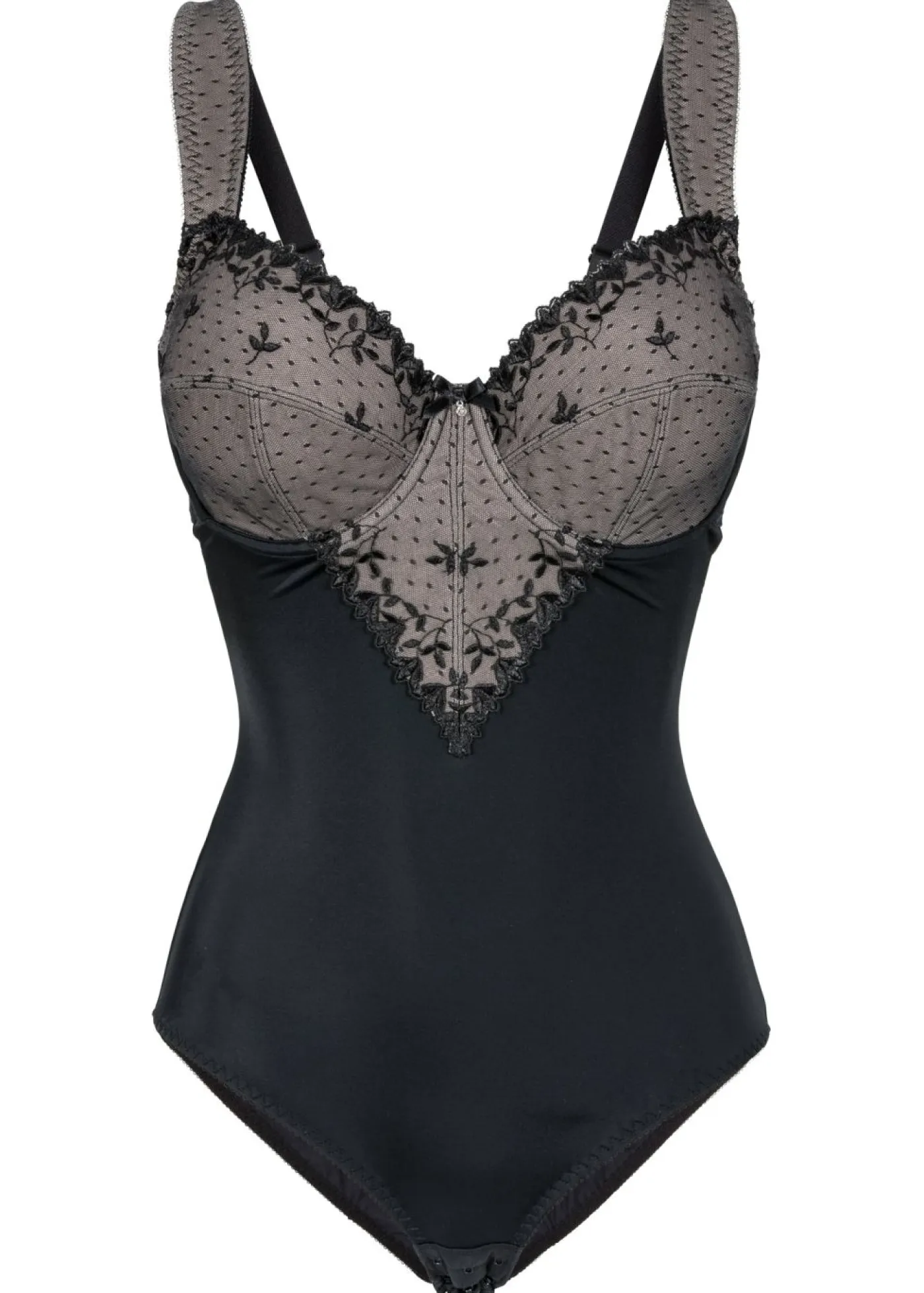Elegante body con detalles de encaje. Con aros, tirantes acolchados, se pueden cerrar en la entrepierna, cierre de sujetador en la parte posterior.