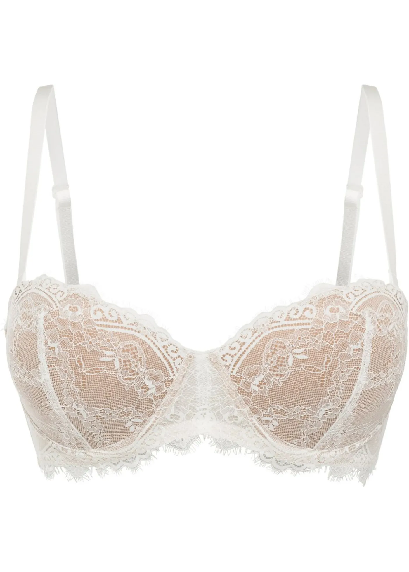 Sujetador tipo balconette de encaje suave con tirantes desmontables. Este cómodo sujetador estilo balconette sin tirantes de la marca BODYFLIRT crea un gran escote. El atractivo sujetador con aros está adornado con encaje suave y cuenta con copas acolchadas preformadas. Nuestros sujetadores sin tirantes se ajustan desde la parte inferior del pecho para poder utilizarlos fácilmente sin tirantes.