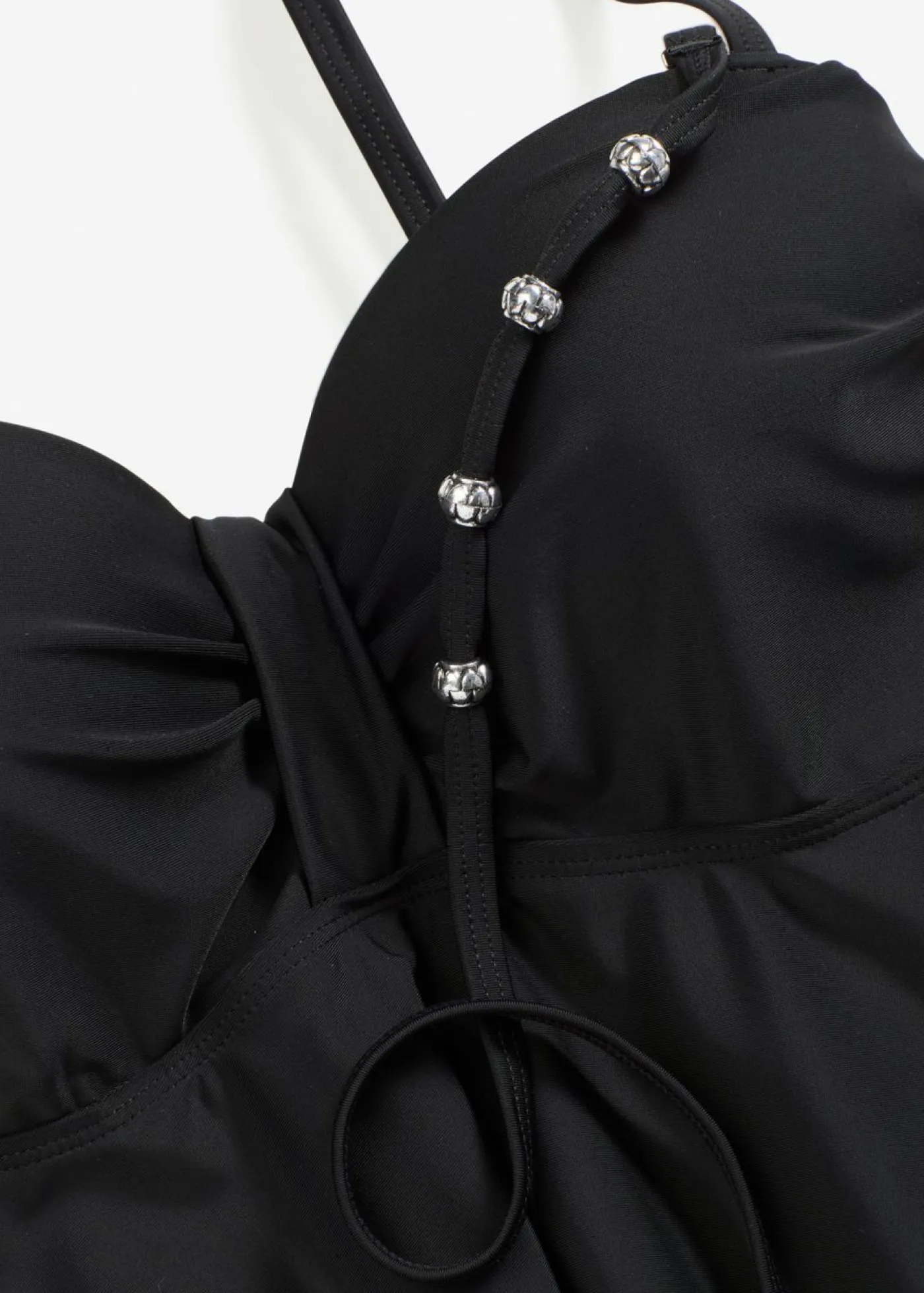 Tankini largo femenino con tirantes desmontables anudados al cuello.