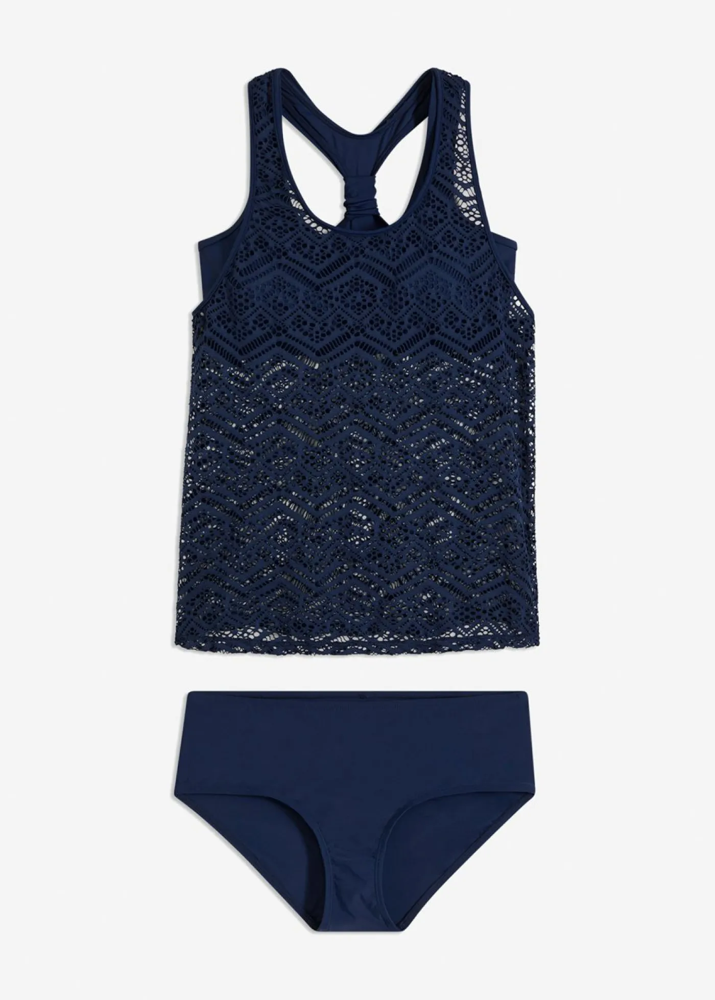 Tankini moderno con encaje de ganchillo. Prenda superior de dos capas: top de encaje de ganchillo, bustier con copas blandas extraíbles y goma elástica bajo el pecho. El bustier y el top se abrochan en la parte posterior. Braga ligeramente más ancha y confeccionada con el mismo material que el bustier.
