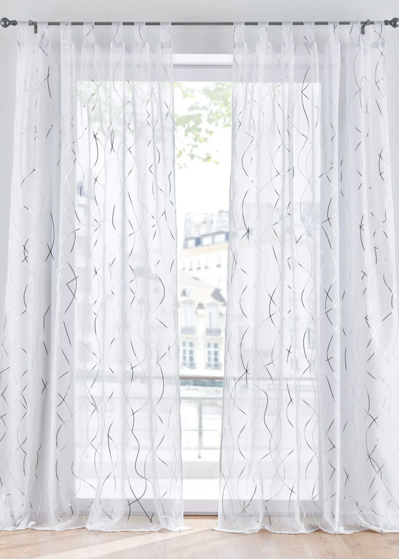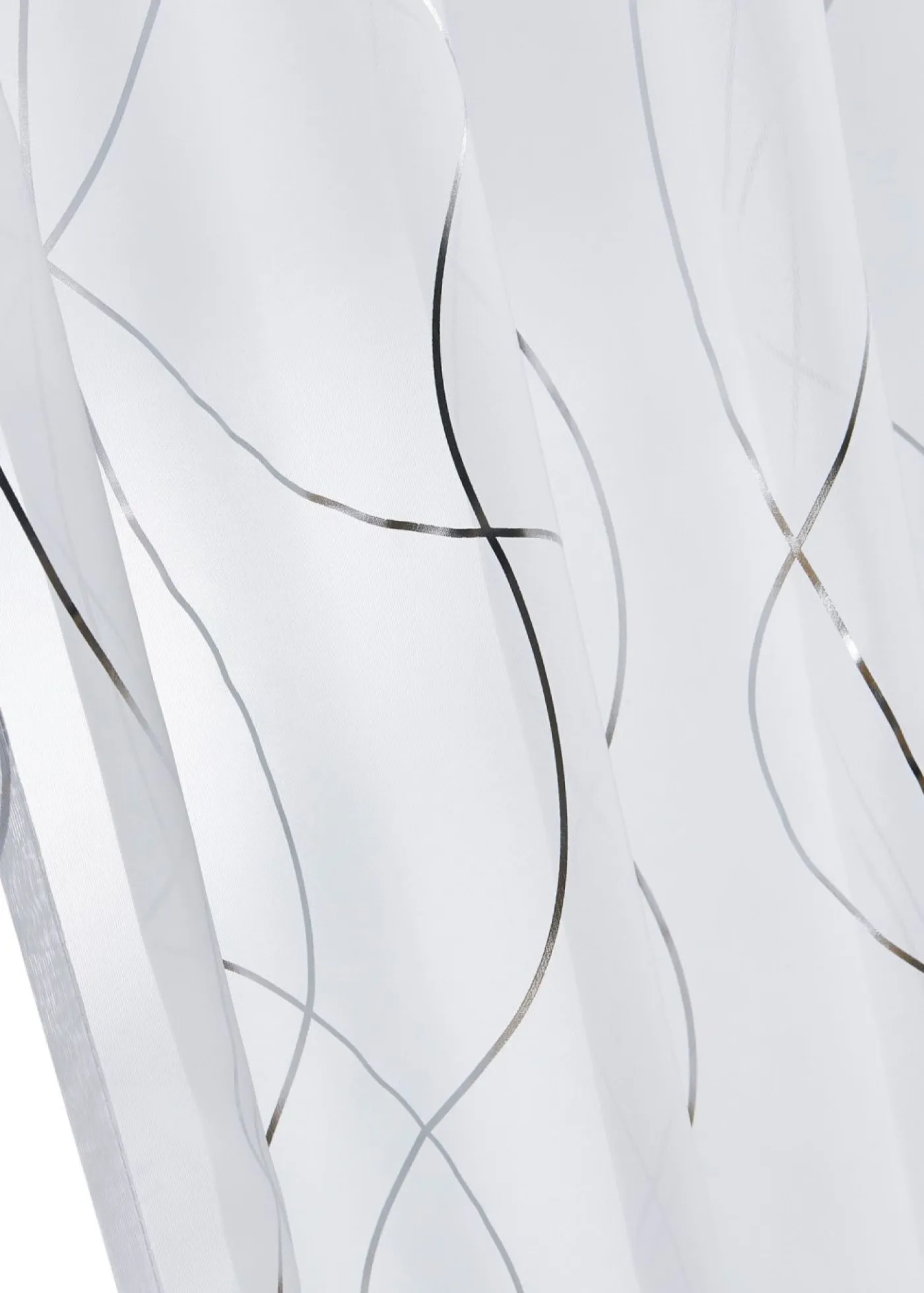 Cortina con detalles brillantes. Esta cortina presenta un diseño extraordinario con efectos espectaculares en una combinación de colores acogedora. El velo transparente está estampado con ondas brillantes, que son de color plateado en la parte posterior de la cortina, por lo que también destacan desde el exterior. Con esta cortina, tu imaginación decorativa no tendrá límites.