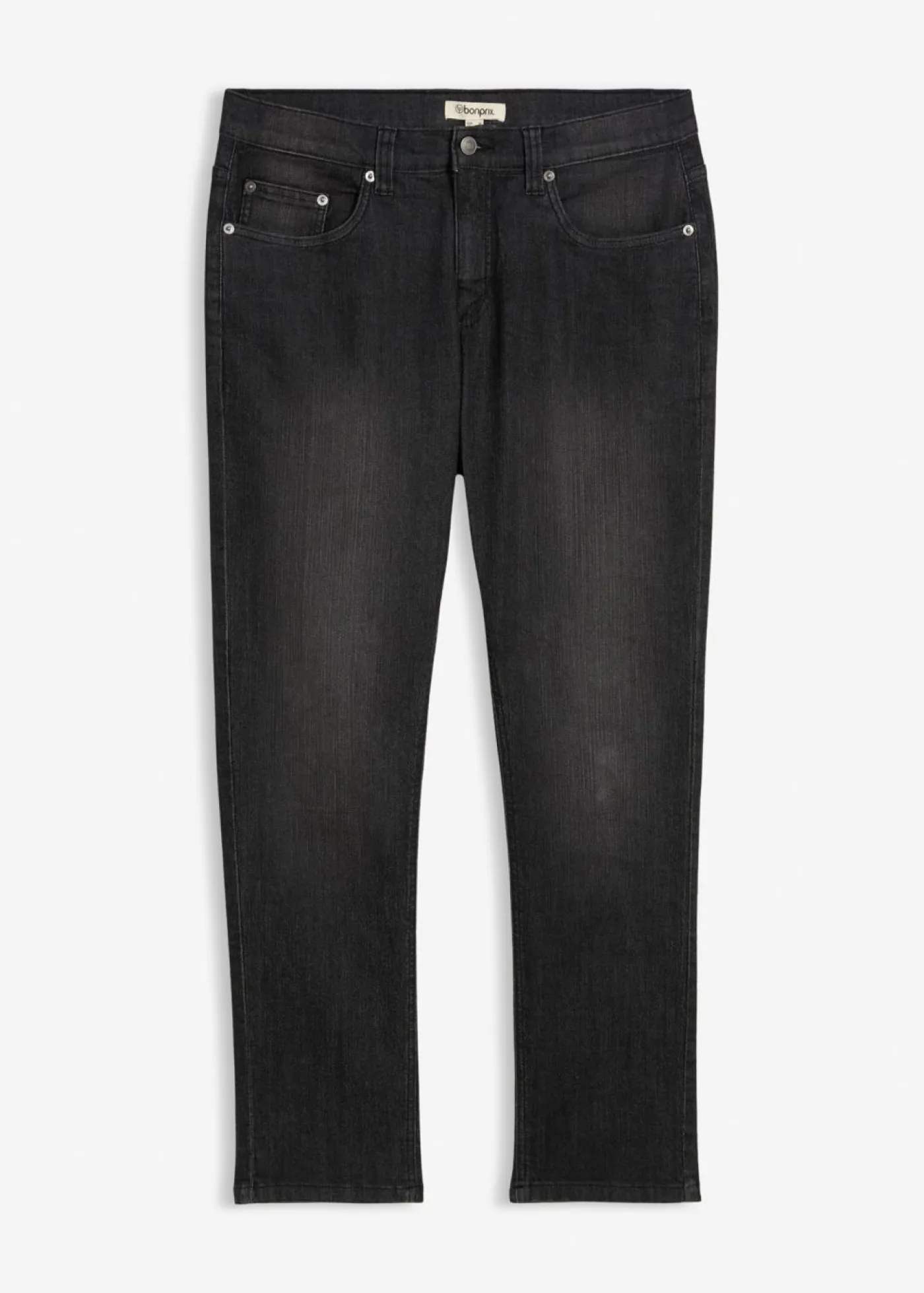 Modernos vaqueros elásticos de corte slim y recto con ligero lavado.