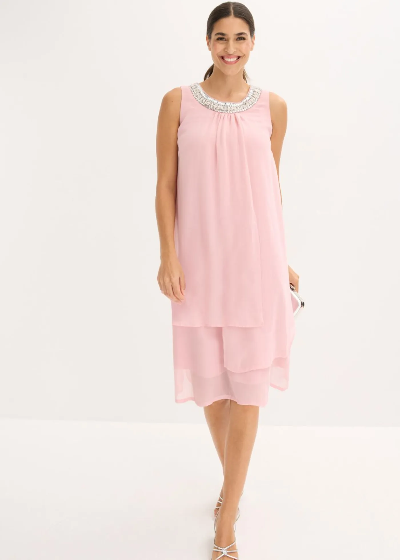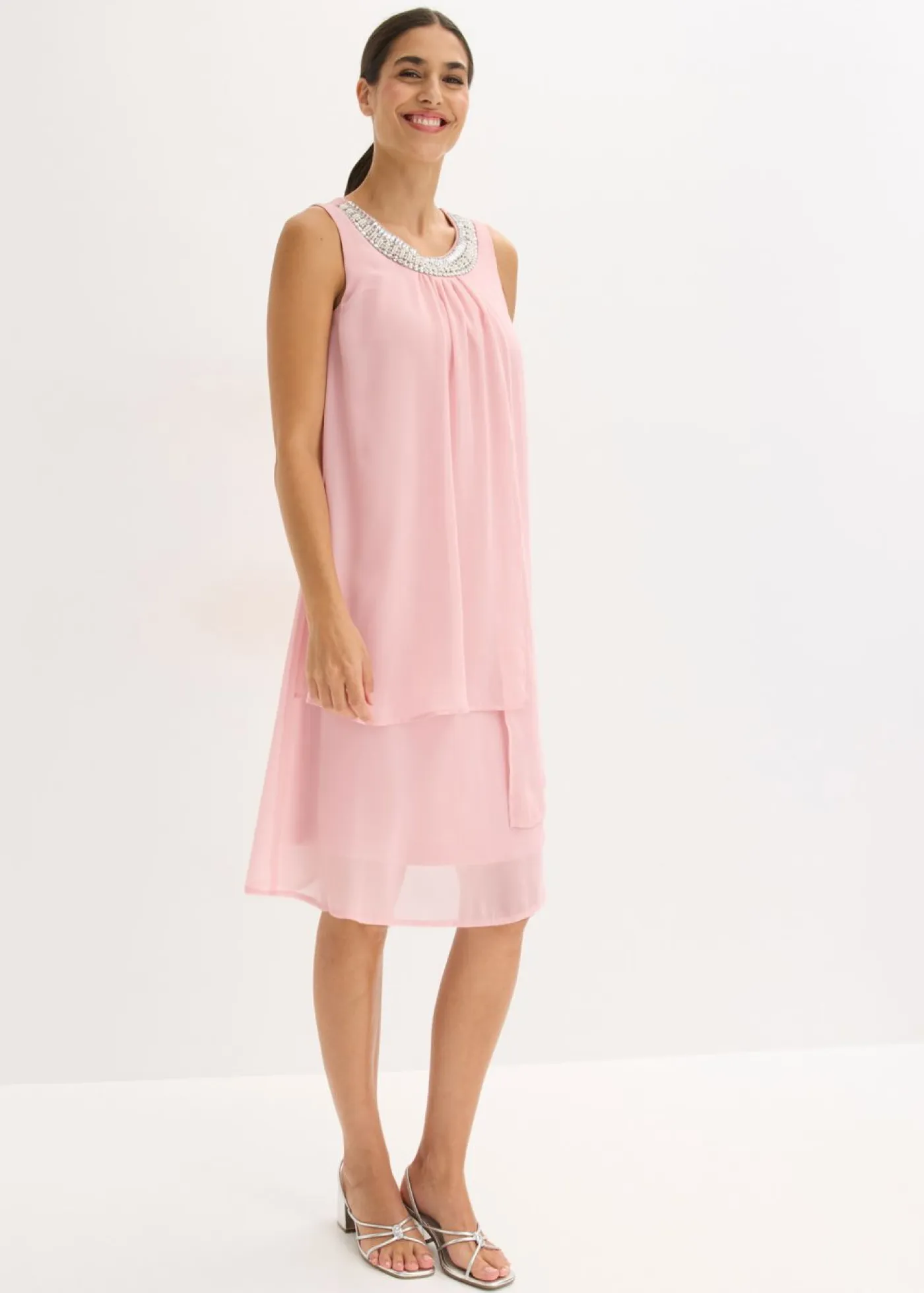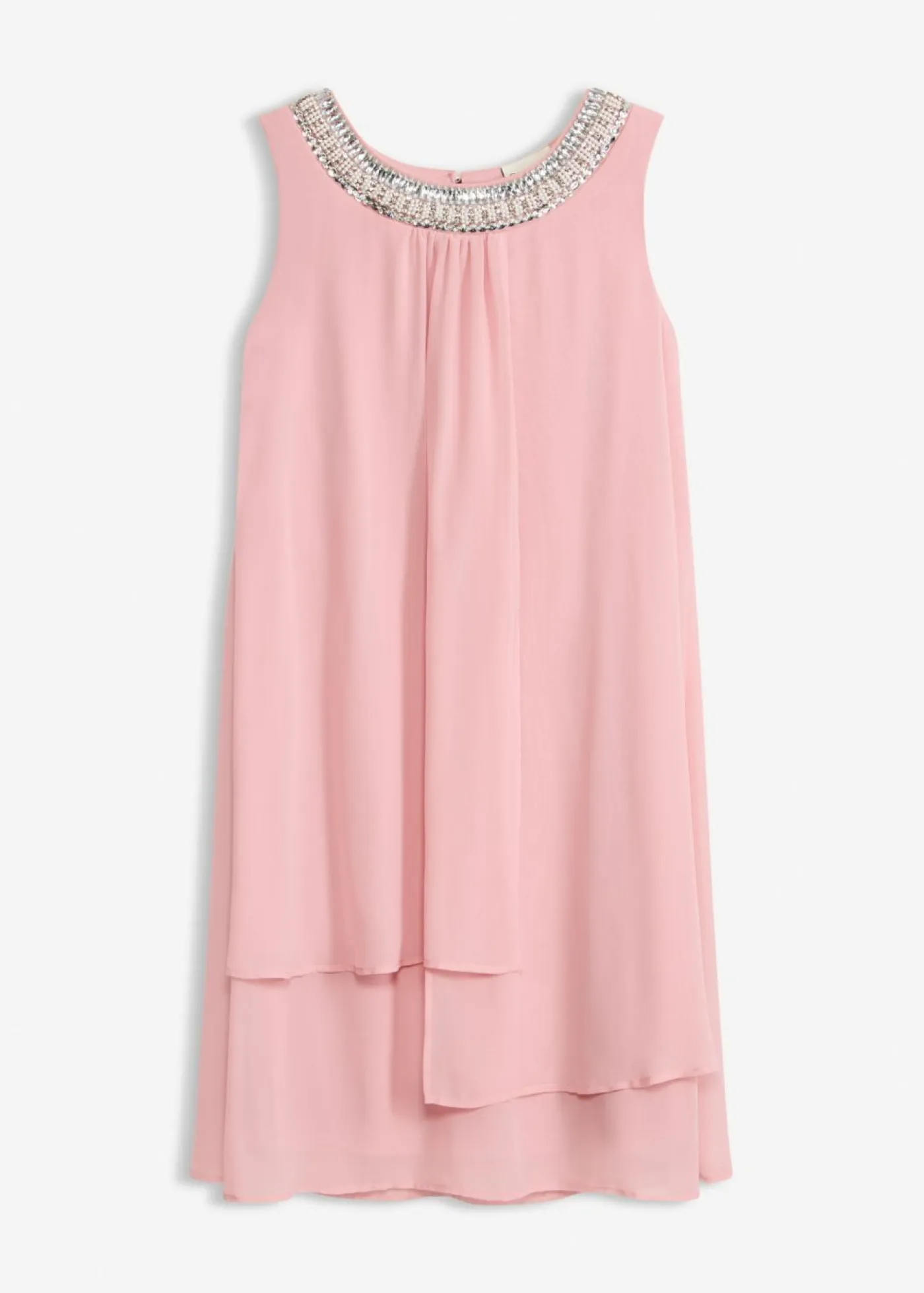 Minivestido elegante y acolchado de gasa fina con piedras brillantes en el escote. Elegante vestido fluido con elegantes aplicaciones de perlas en el cuello redondo. Largo de aprox. 100 cm (talla 42). Se debe lavar a mano.