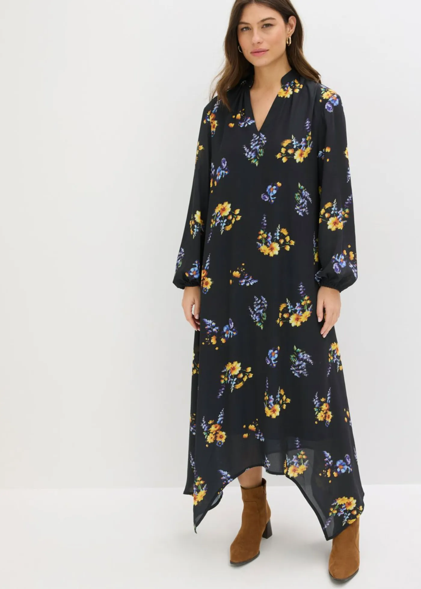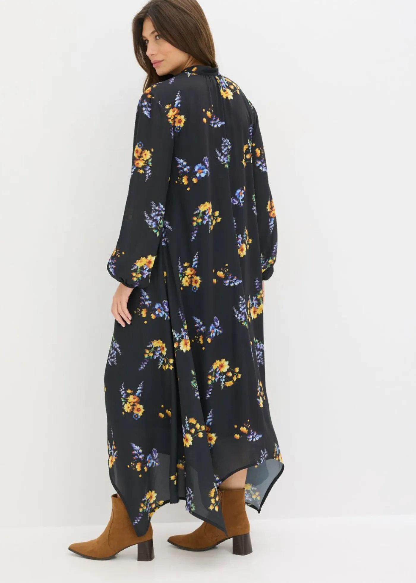 Vestido largo de gasa con corte holgado y dobladillo asimétrico.