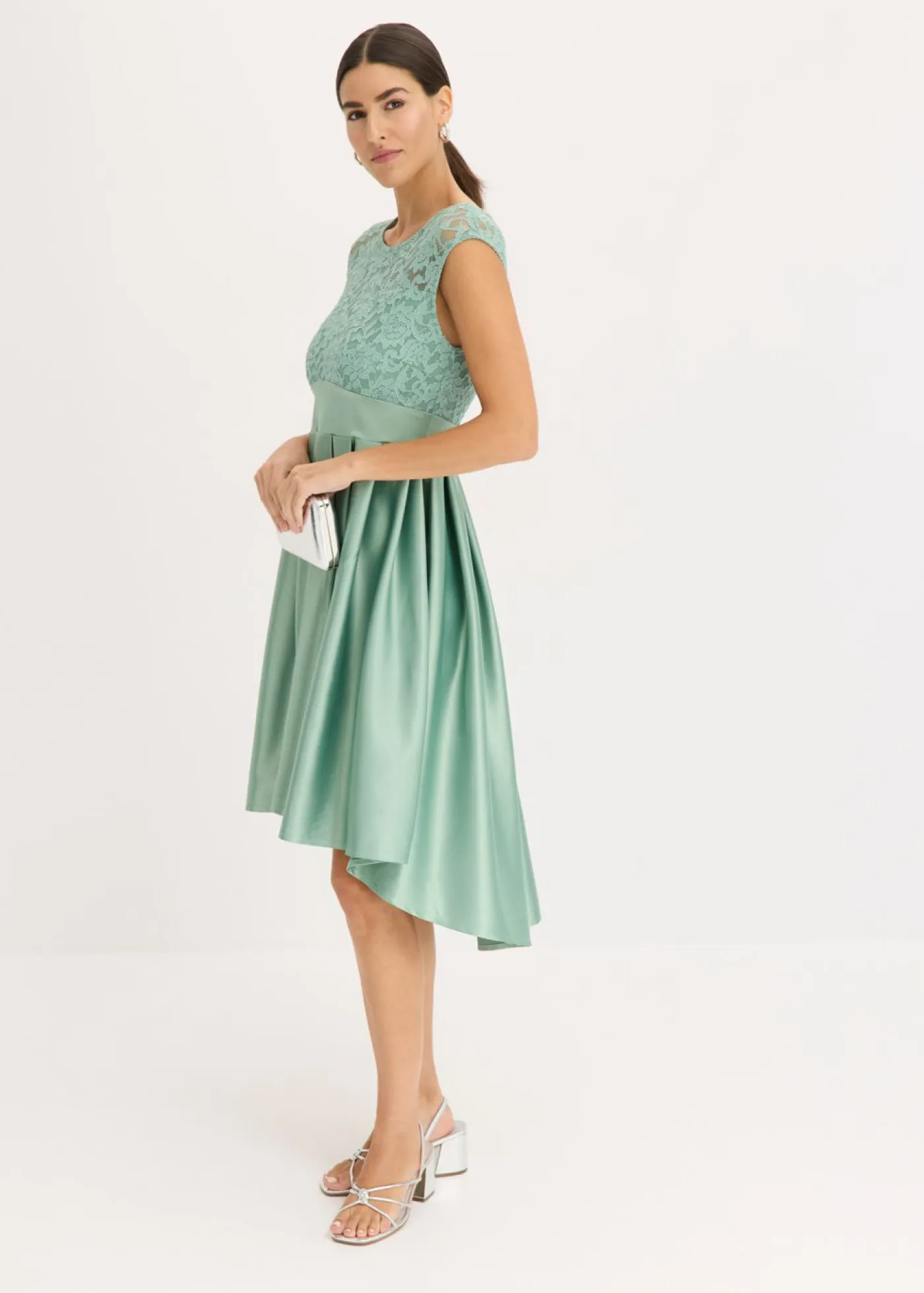 Vestido asimétrico de satén brillante con encaje