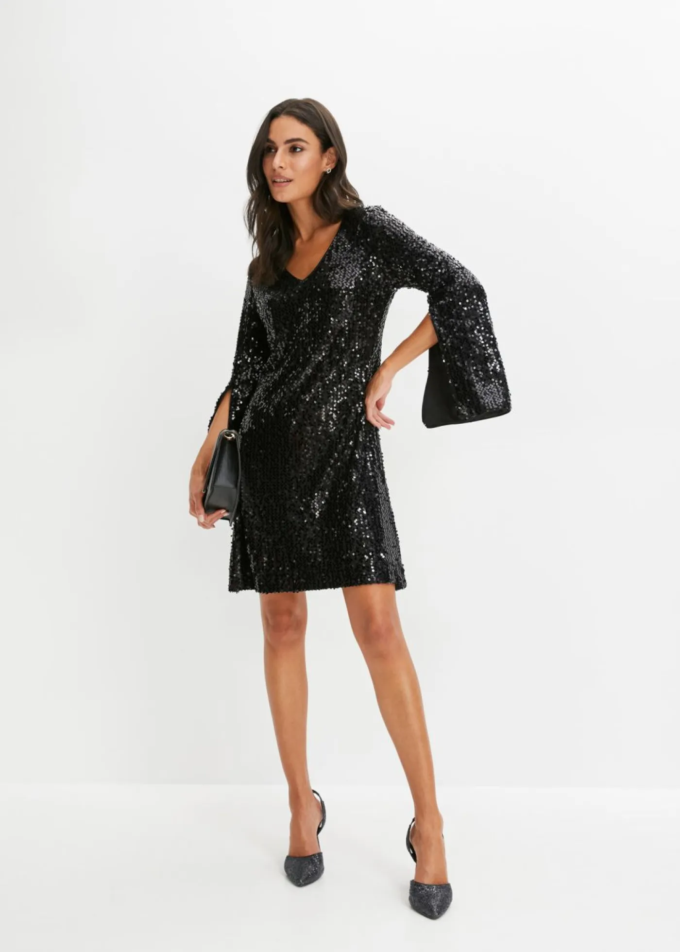 Vestido de lentejuelas con mangas de trompeta, Largo regular