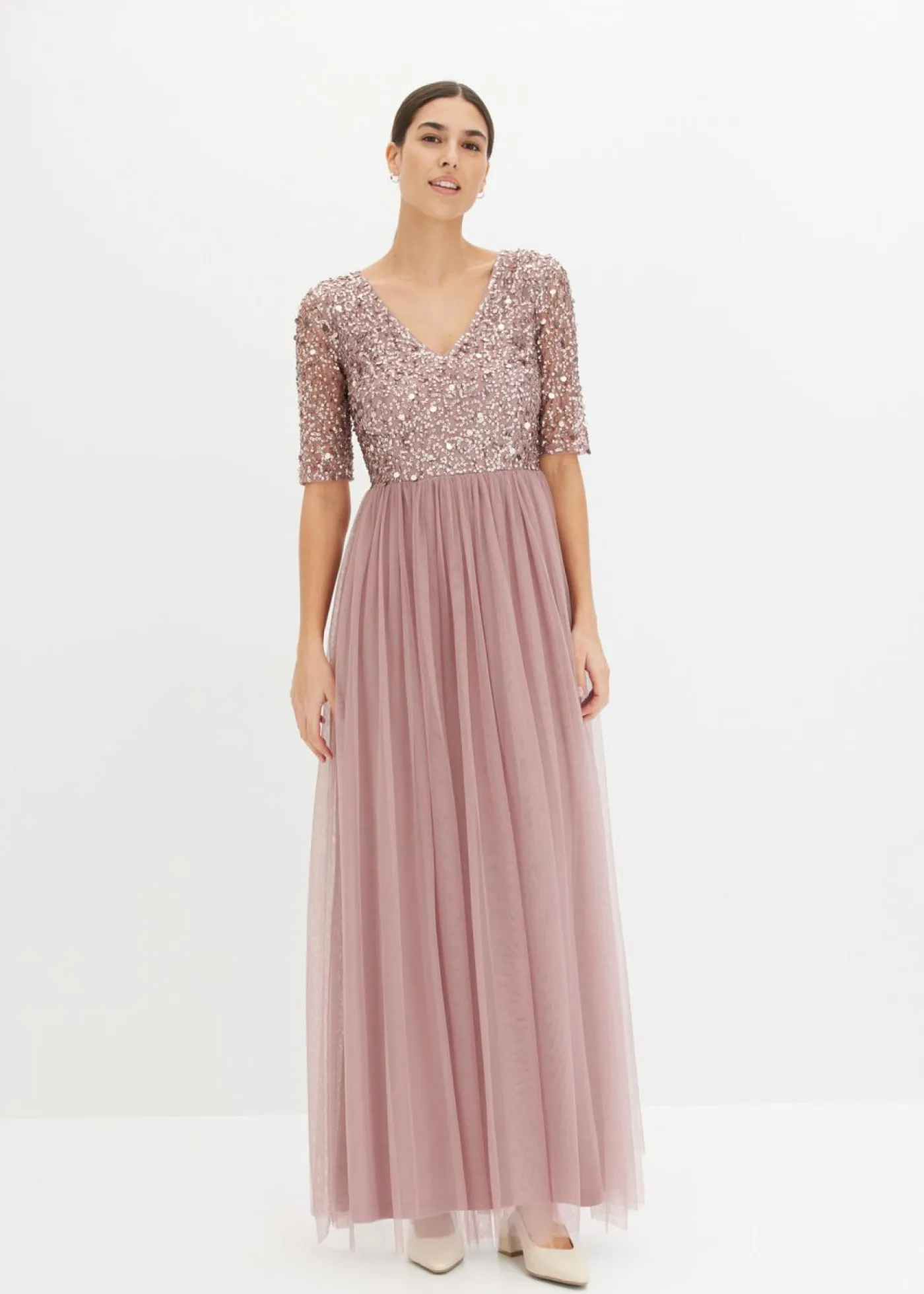 Vestido de noche de tul delicado con bordado de lentejuelas, Largo petite