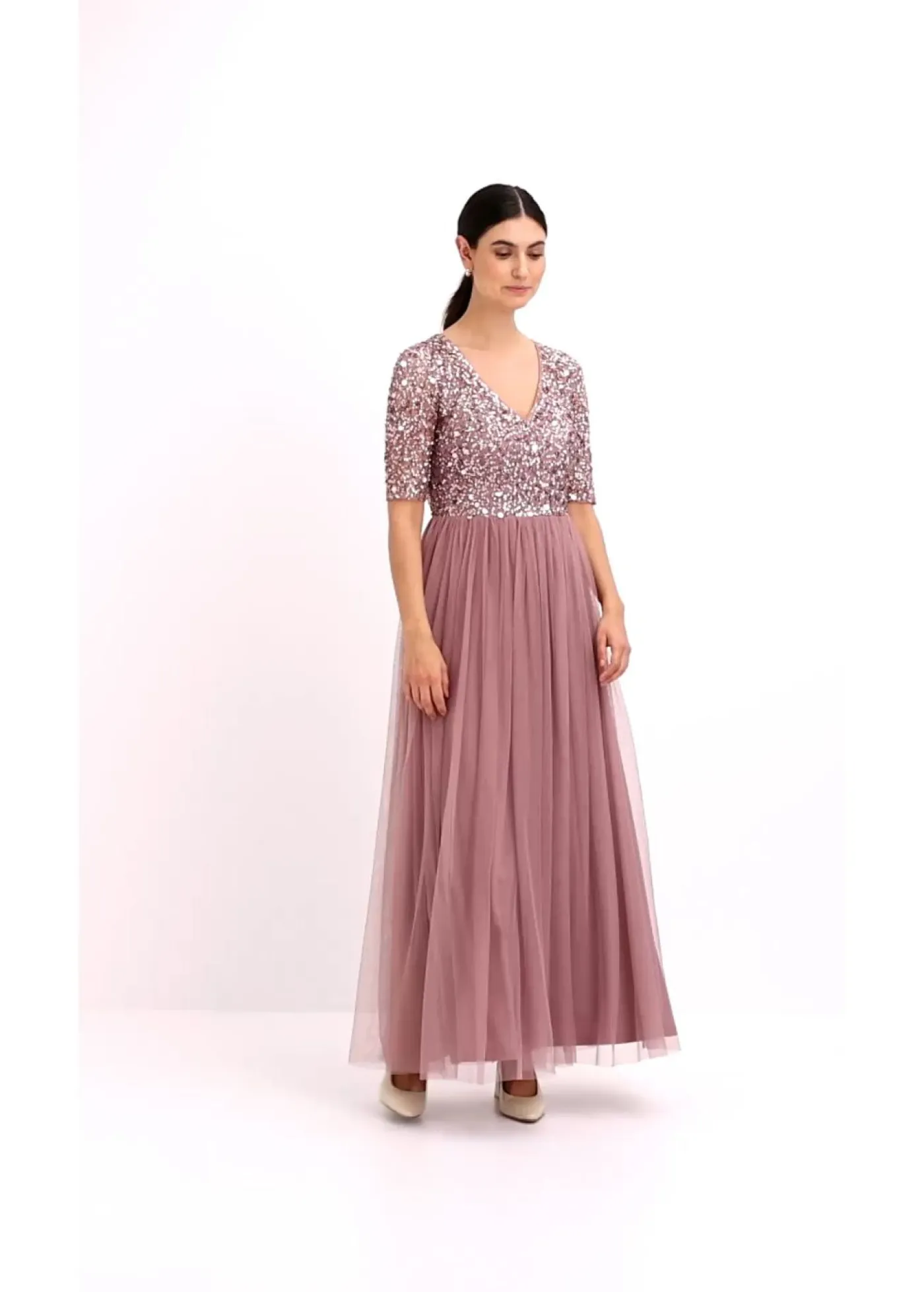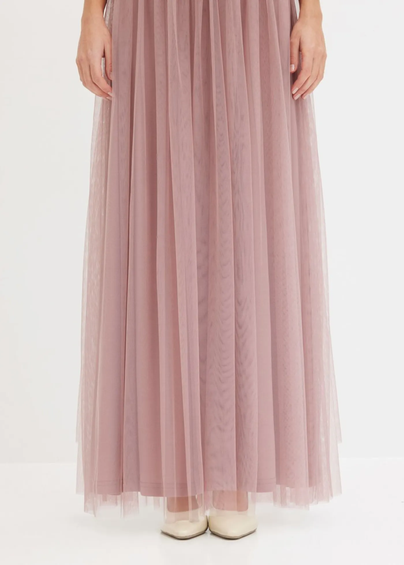Elegante vestido de tul con un maravilloso bordado de lentejuelas en la parte superior.